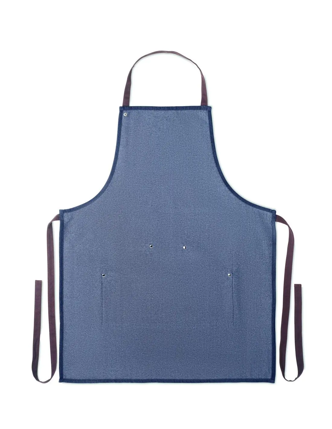 Delantal de cocina ajustable con 3 bolsillos delanteros en tejido denim de 240 gr/m² con tirantes de algodón. Presentado en caja individual.
