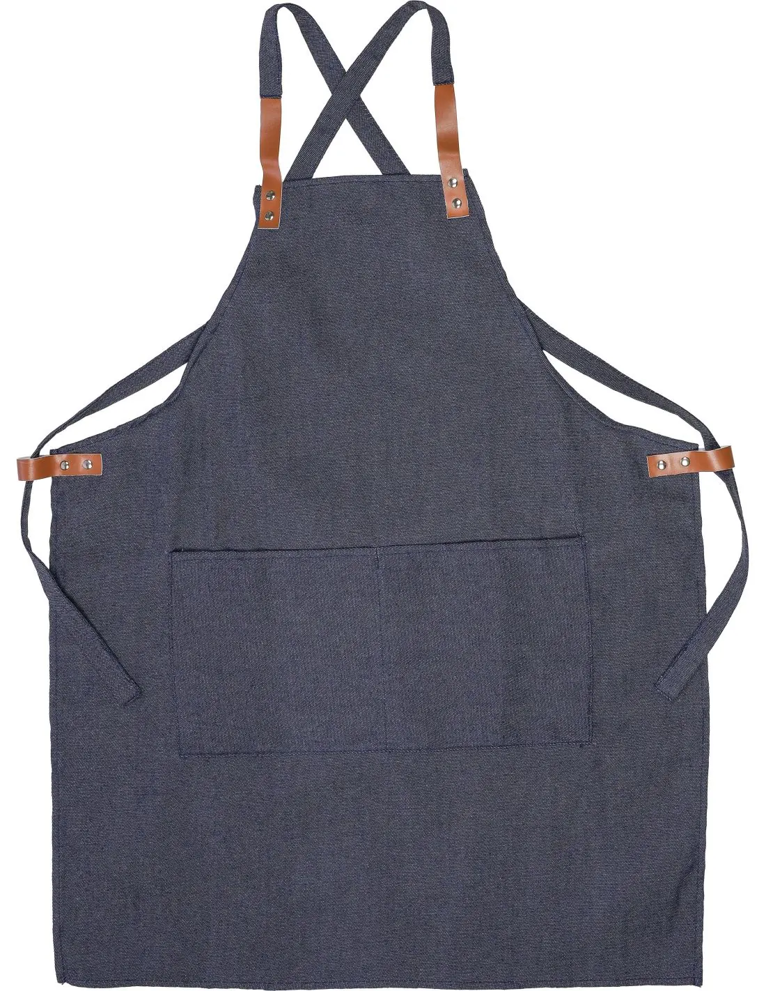 Delantal de mezclilla 65 % poliéster y 35 % algodón (280 g/m2) con tirantes y dos bolsillos delanteros. Se ajusta a los hombros mediante las correas. Presentado en una caja de regalo de cartón marrón.