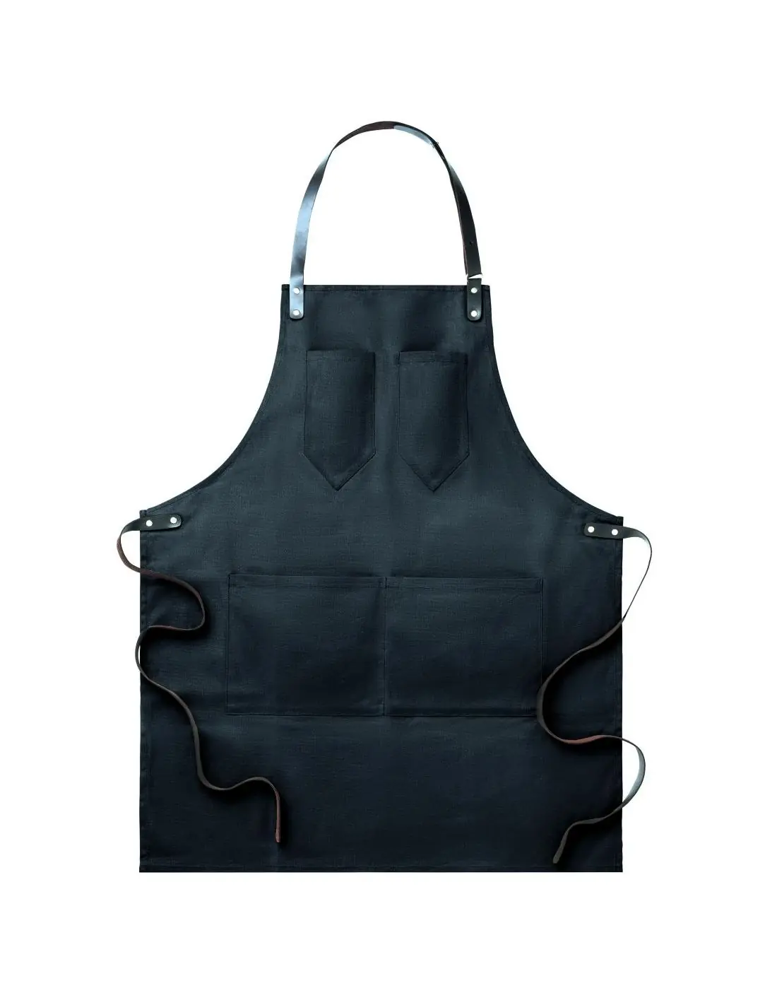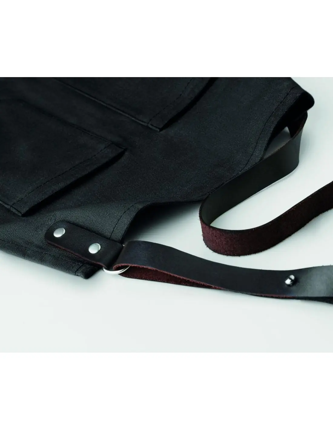 Delantal de lona encerada de algodón con correas ajustables de piel. 2 bolsillos en el pecho y 1 bolsillo grande en cintura.