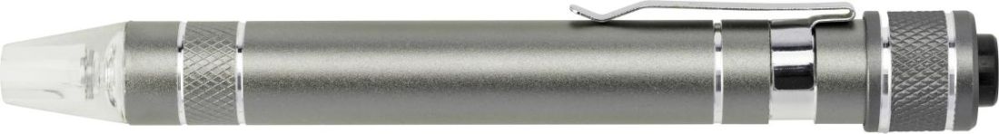 Soporte de metal en forma de bolígrafo con luz. En la parte superior contiene 6 cabezales de destornillador. 3 de cabezal plano (CR-V1.5, 2.0 y 3.0), 3 Philips (CR-VPH0, 2 y 4) y pulsador. Pilas incluidas.