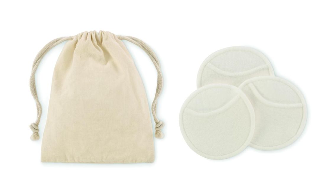 3 discos suaves reutilizables y lavables para la limpieza facial (diámetro 8 cm) fabricados con un 70% de fibra de bambú y un 30% de algodón. Presentado en bolsa de algodón.