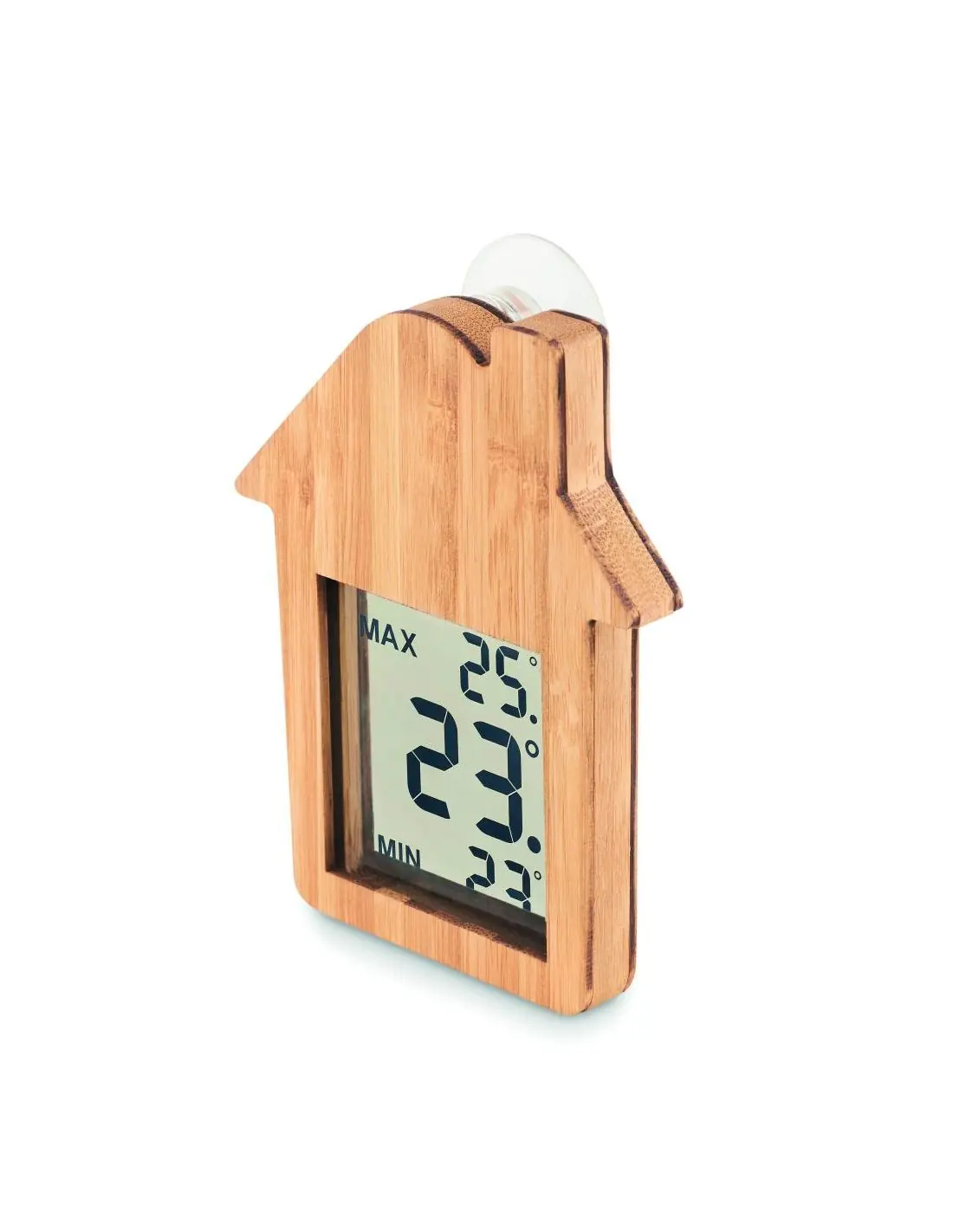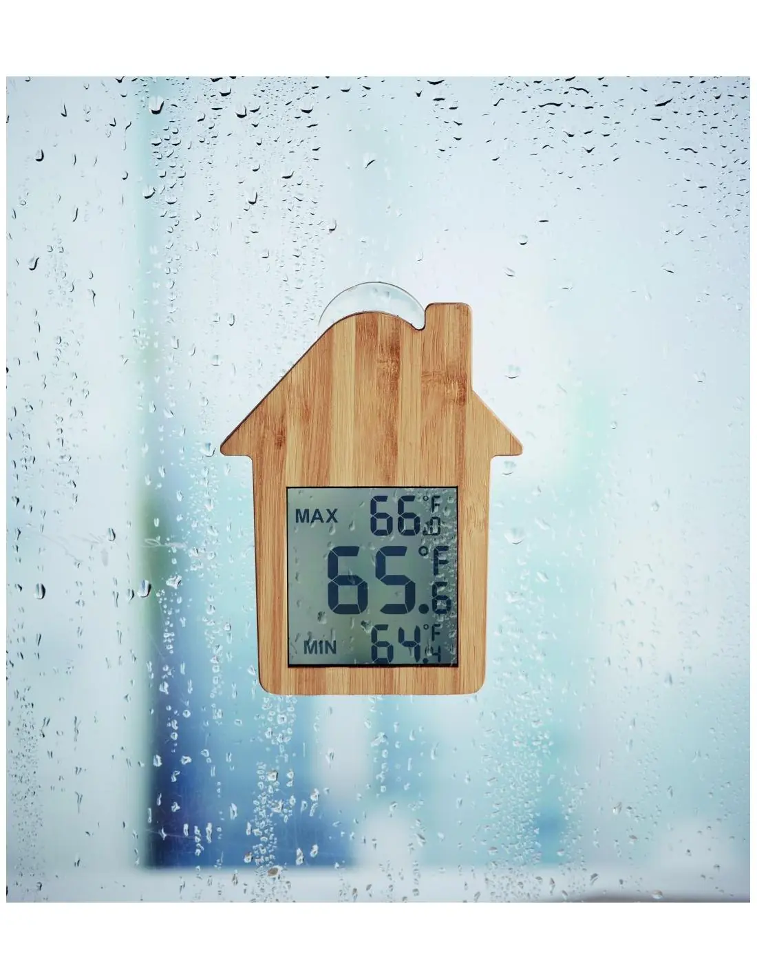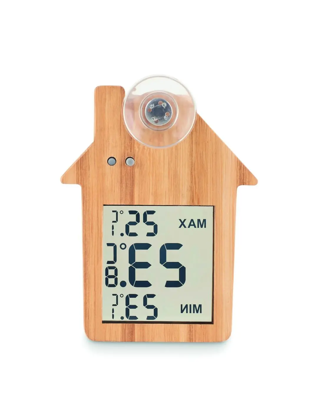 Estación meteorológica en forma de casa de bambú con ventosa en la parte posterior. Incluye 1 pila LR44. El bambú es material natural, el color del articulo puede variar.