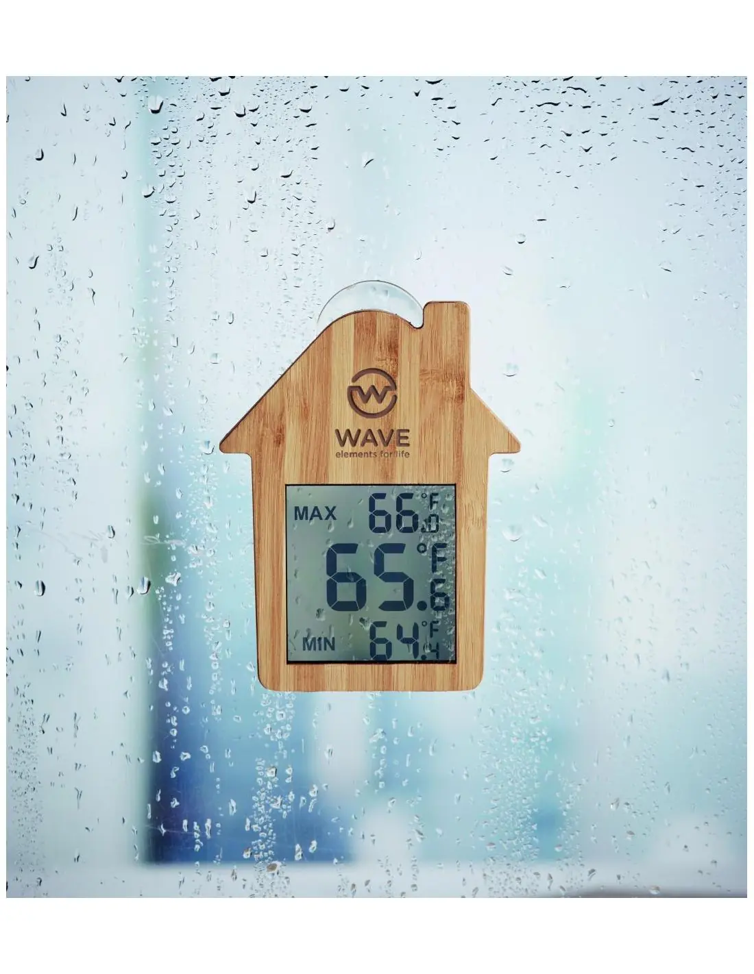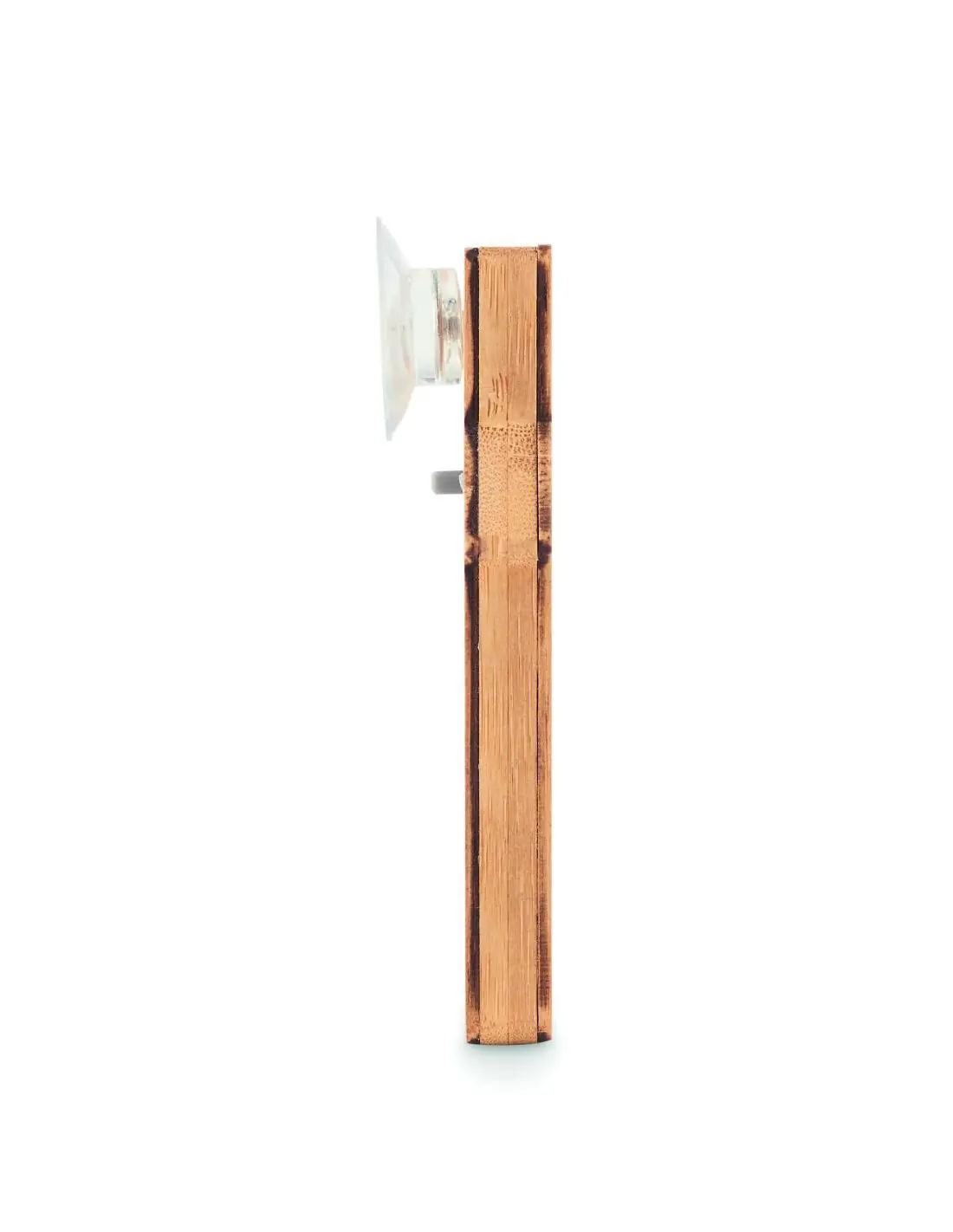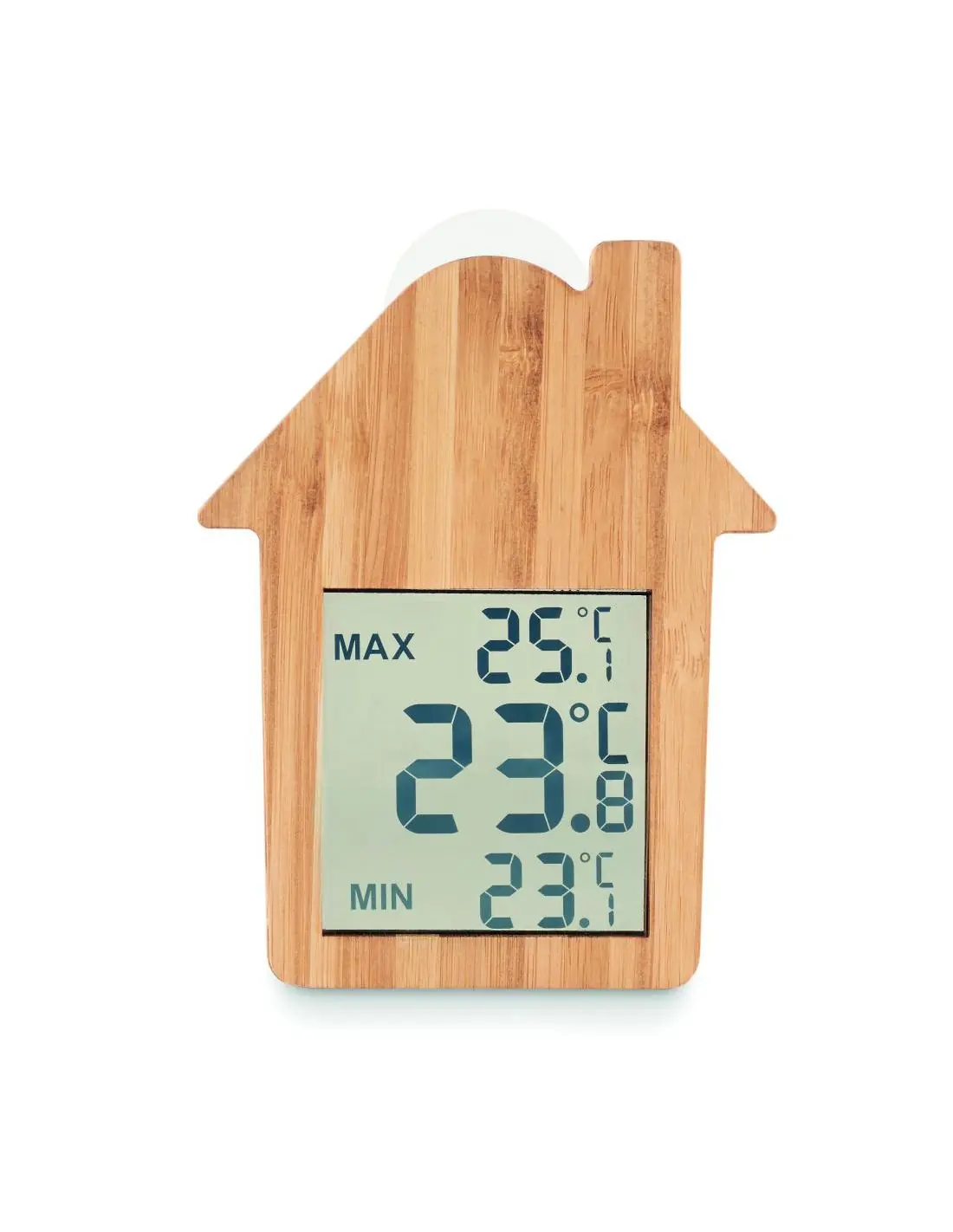 Estación meteorológica en forma de casa de bambú con ventosa en la parte posterior. Incluye 1 pila LR44. El bambú es material natural, el color del articulo puede variar.