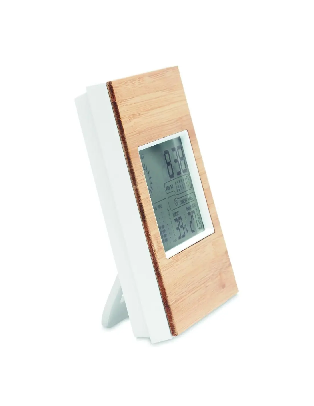 Estación meteorológica multifunción con carcasa de bambú. Incluye reloj, temperatura, humedad relativa y calendario. Funciona con 2 pilas AAA no incluidas. El bambú es un producto natural, puede haber ligeras variaciones en el color y el tamaño por artículo, lo que puede afectar el resultado final de la impresión.