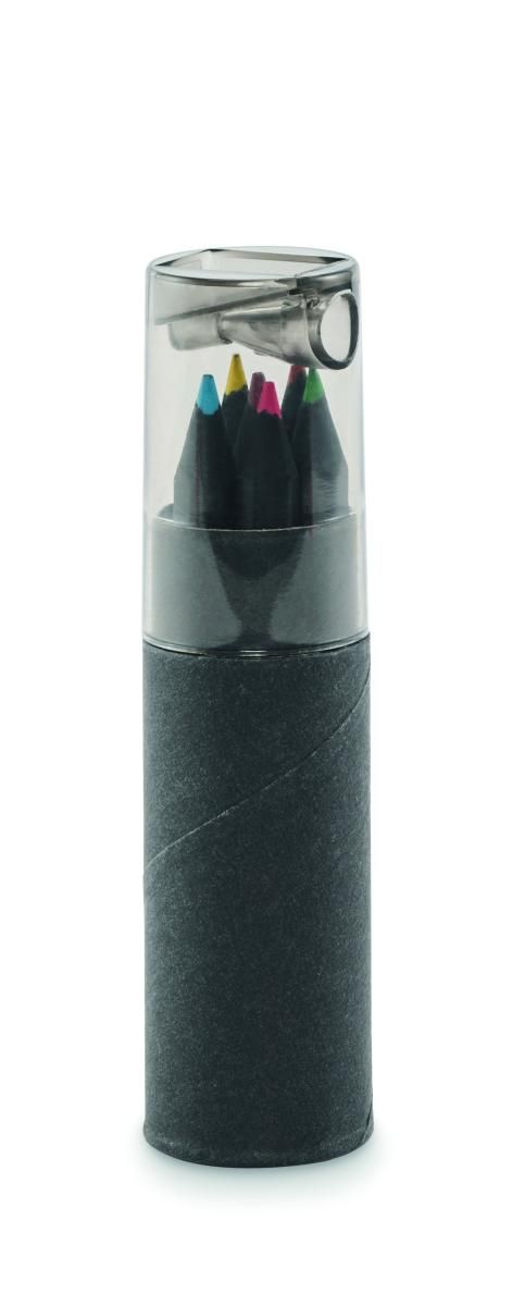 Set de 6 lápices de colores presentados en un tubo de cartón negro con sacapuntas en la tapa.