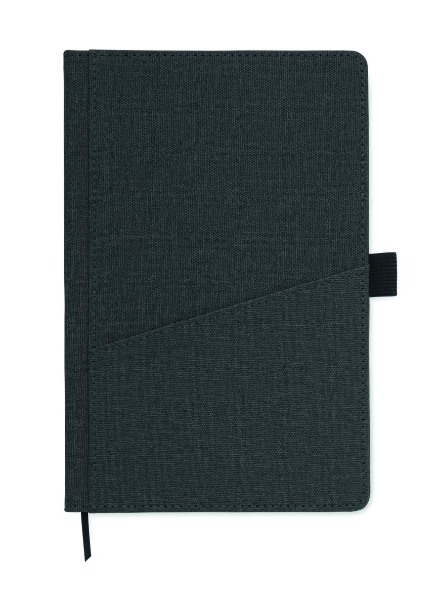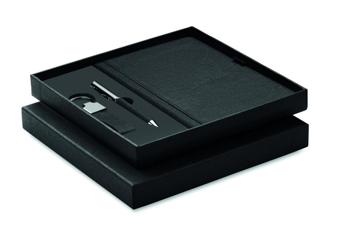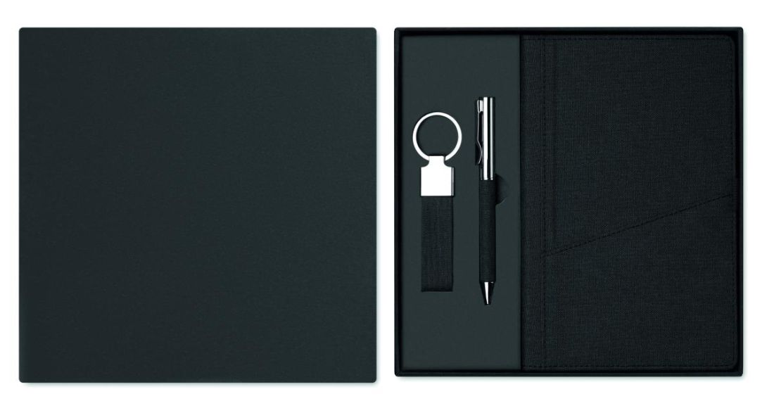 Set de regalo de 3 piezas en caja de regalo. Incluye bolígrafo giratorio de metal con detalle de poliéster RPET, cuaderno de tapas duras RPET con bolsillo frontal para smartphone y llavero de poliéster RPET. Tinta azul. FSC MIX CREDIT | P7.1 | FSC-C213206