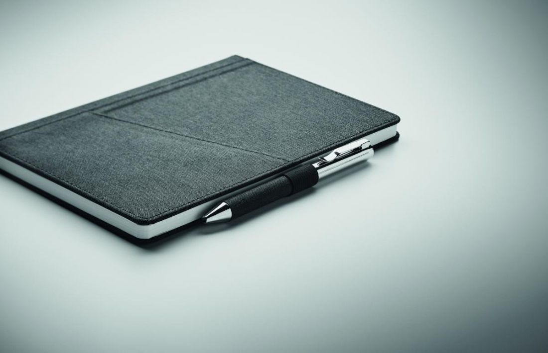 Set de regalo de 3 piezas en caja de regalo. Incluye bolígrafo giratorio de metal con detalle de poliéster RPET, cuaderno de tapas duras RPET con b…