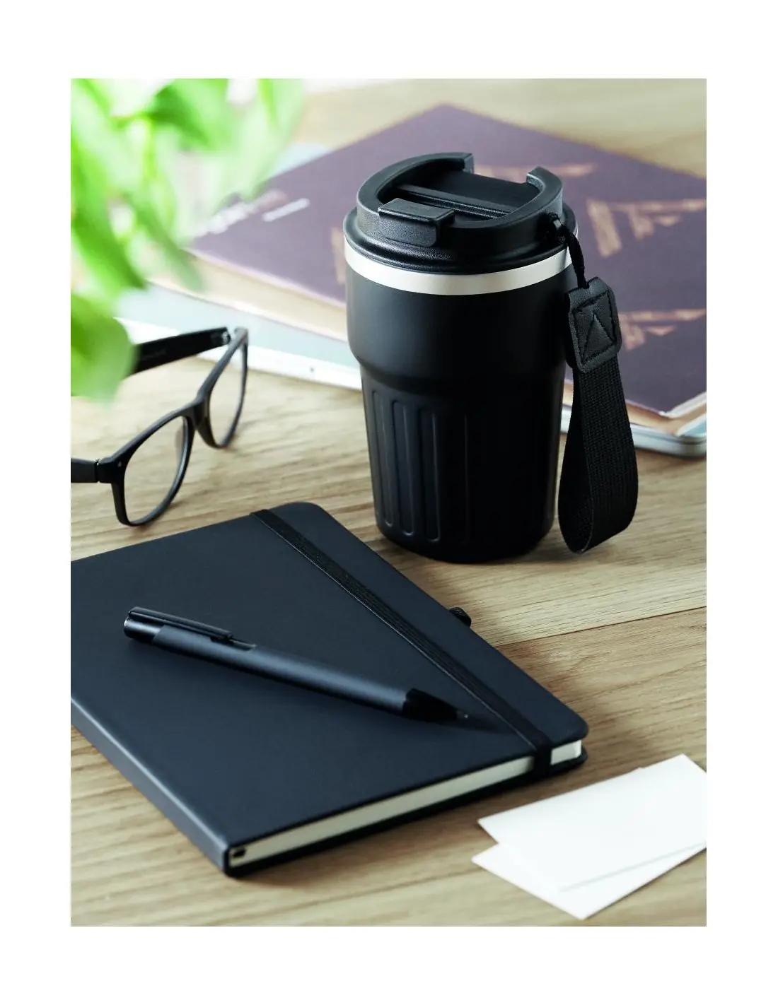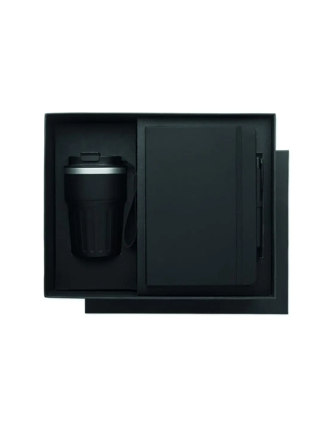 Set de regalo con cuaderno A5, bolígrafo de aluminio reciclado y vaso de 350 ml de acero inoxidable reciclado de doble pared con tapa de PP y correa en caja de regalo.