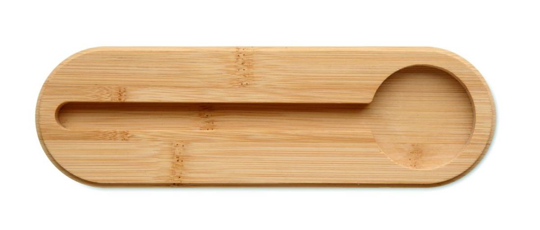 Estuche de fieltro RPET con tapa de bambú y soporte integrado para el teléfono. Regla: 5,5 pulgadas y 13,5 cm. Correa elástica de cierre.