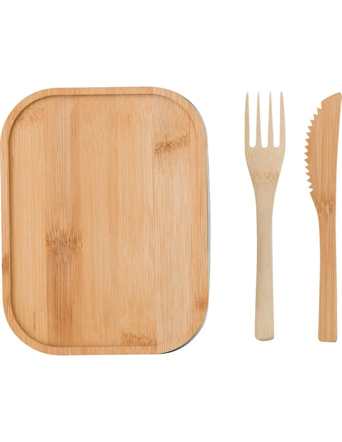 Fiambrera de acero inoxidable (600 ml). Con tapa de bambú y dos cubiertos (tenedor y cuchillo). Incluye correa de nailon. Ideal para ensaladas.