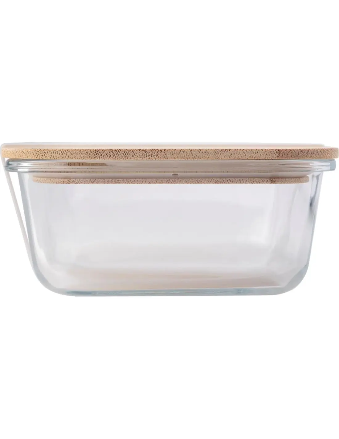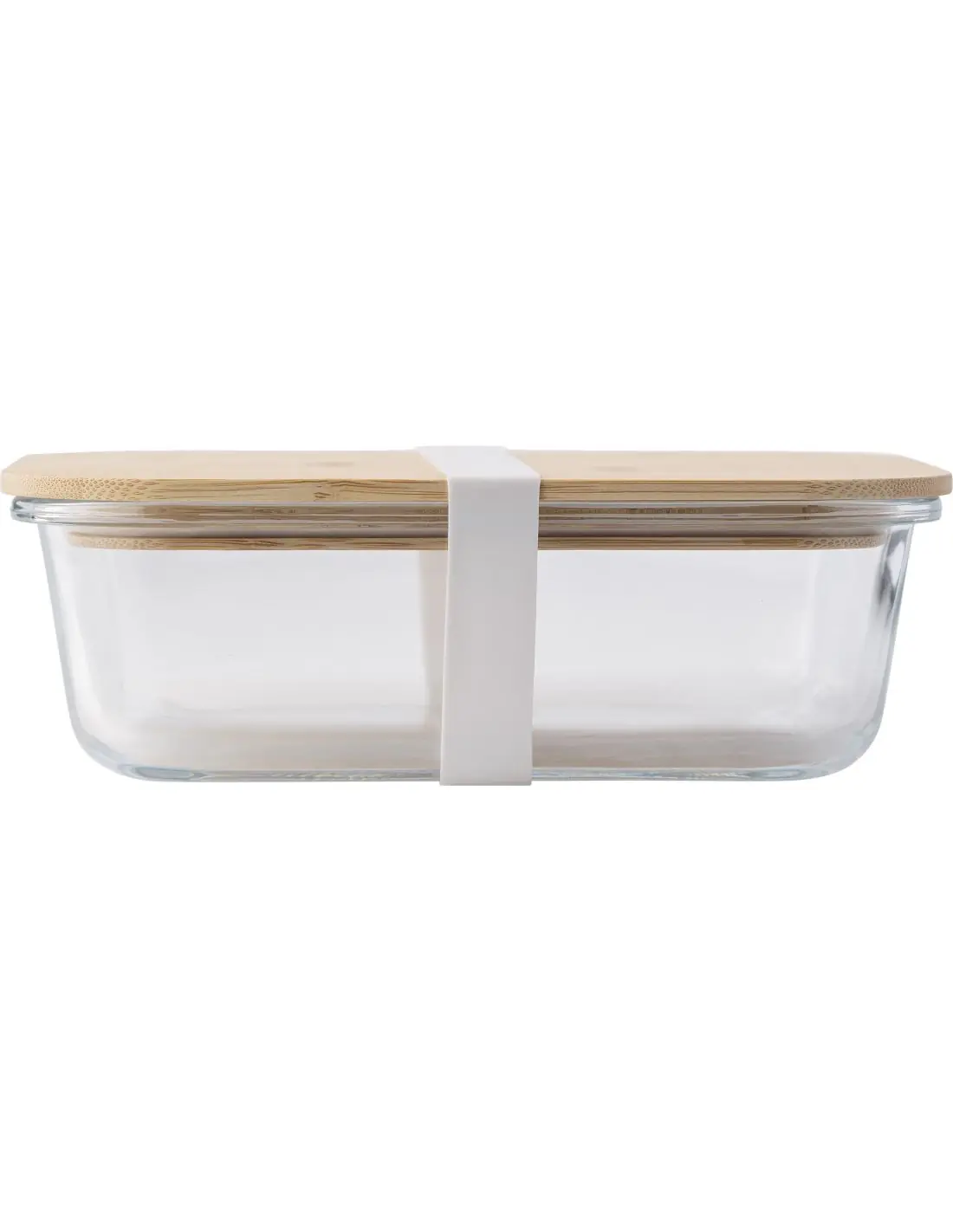 Fiambrera de vidrio (900 ml) con tapa de bambú y correa de silicona.