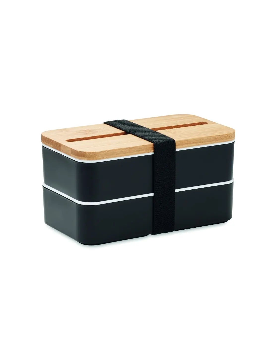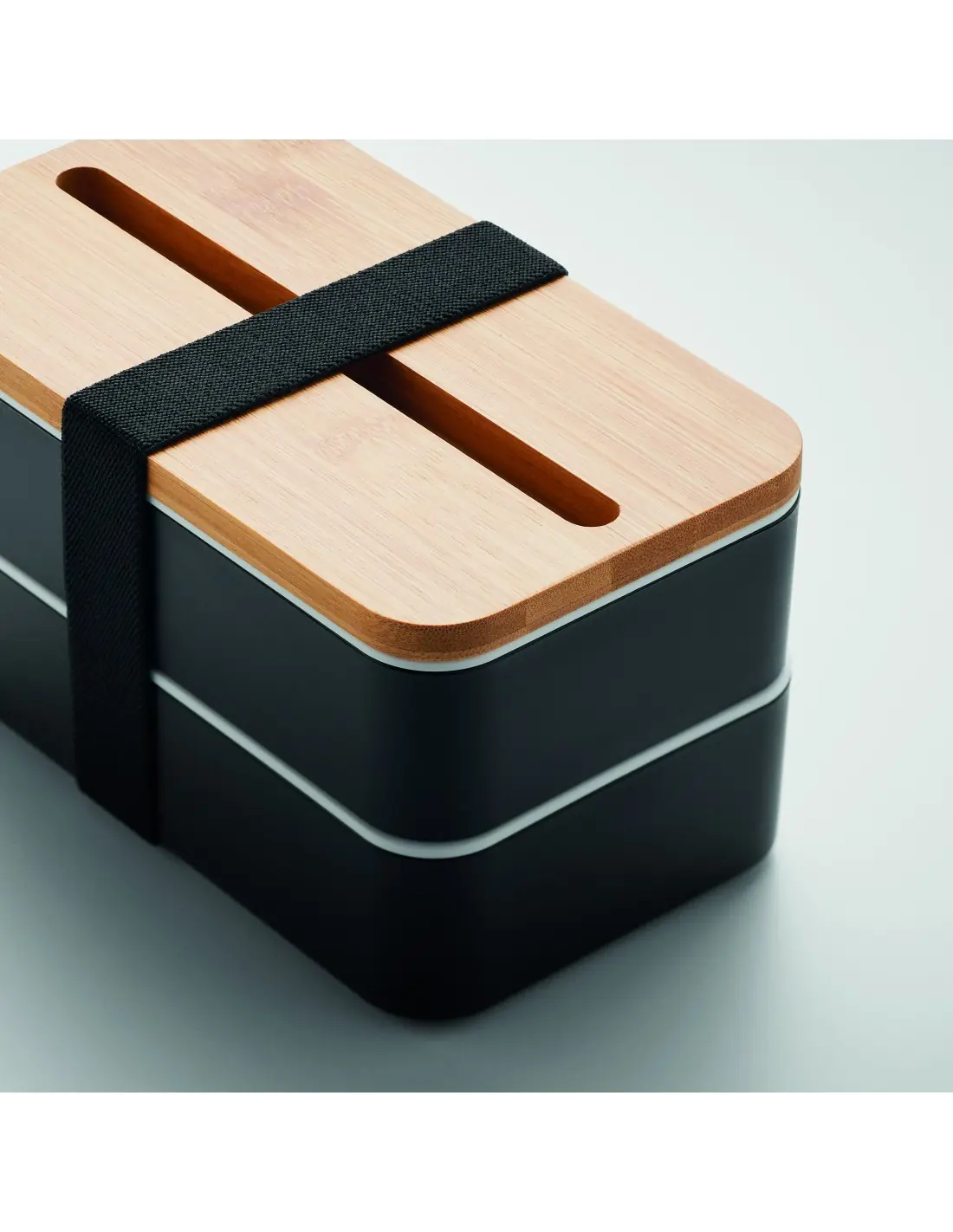 Fiambrera de dos pisos de PP con separador extraíble y 3 cubiertos con banda de poliéster acoplable y tapa de bambú. La tapa tiene función de sopor…