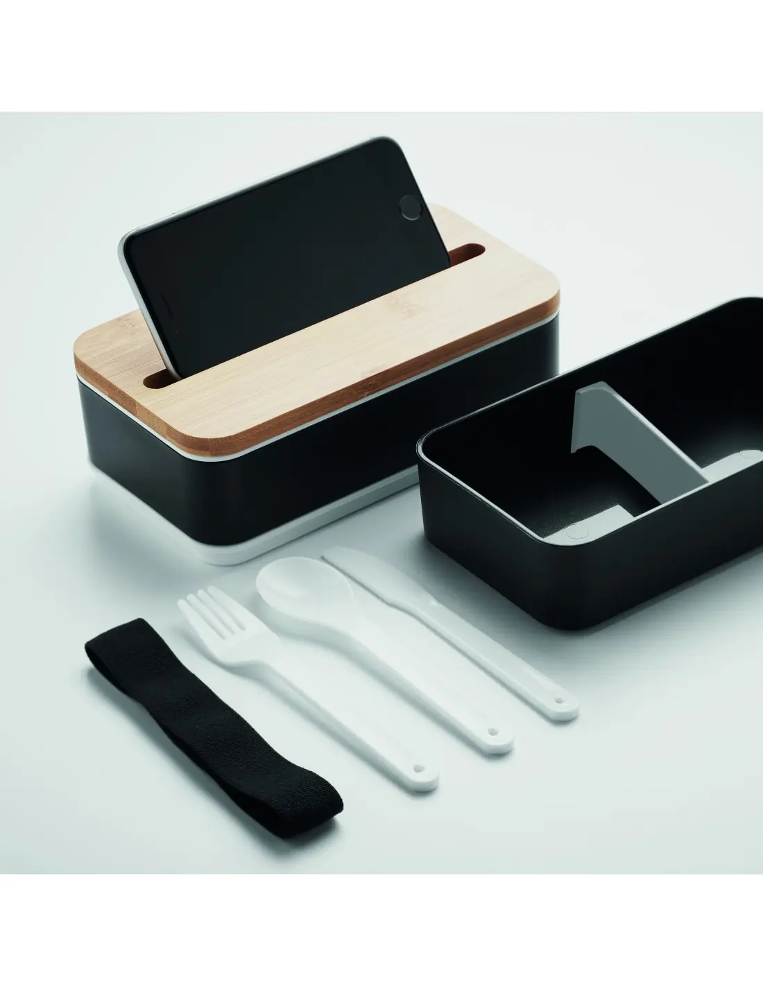 Fiambrera de dos pisos de PP con separador extraíble y 3 cubiertos con banda de poliéster acoplable y tapa de bambú. La tapa tiene función de soporte para el teléfono. Capacidad: 400 ml (2x). El bambú es un material natural, el color del articulo puede variar de unas piezas a otras.