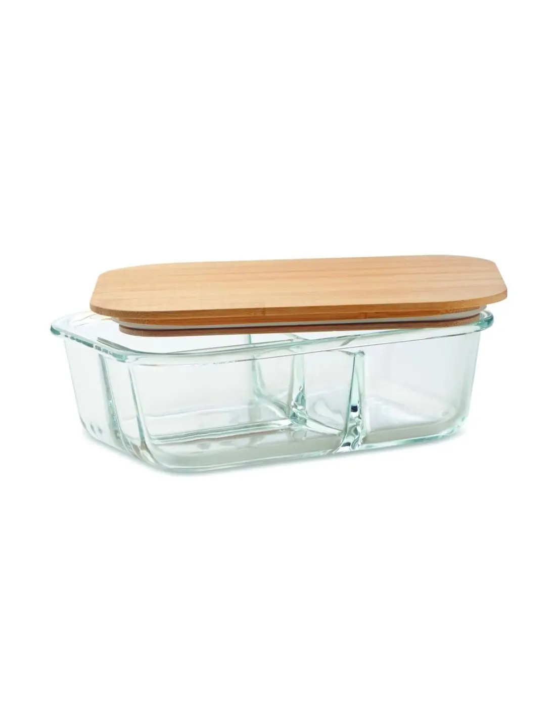 Fiambrera de vidrio de borosilicato con 3 compartimentos, tapa de bambú y banda de silicona. Capacidad: 800 ml. El bambú es un material natural, el color del articulo puede variar de unas piezas a otras.