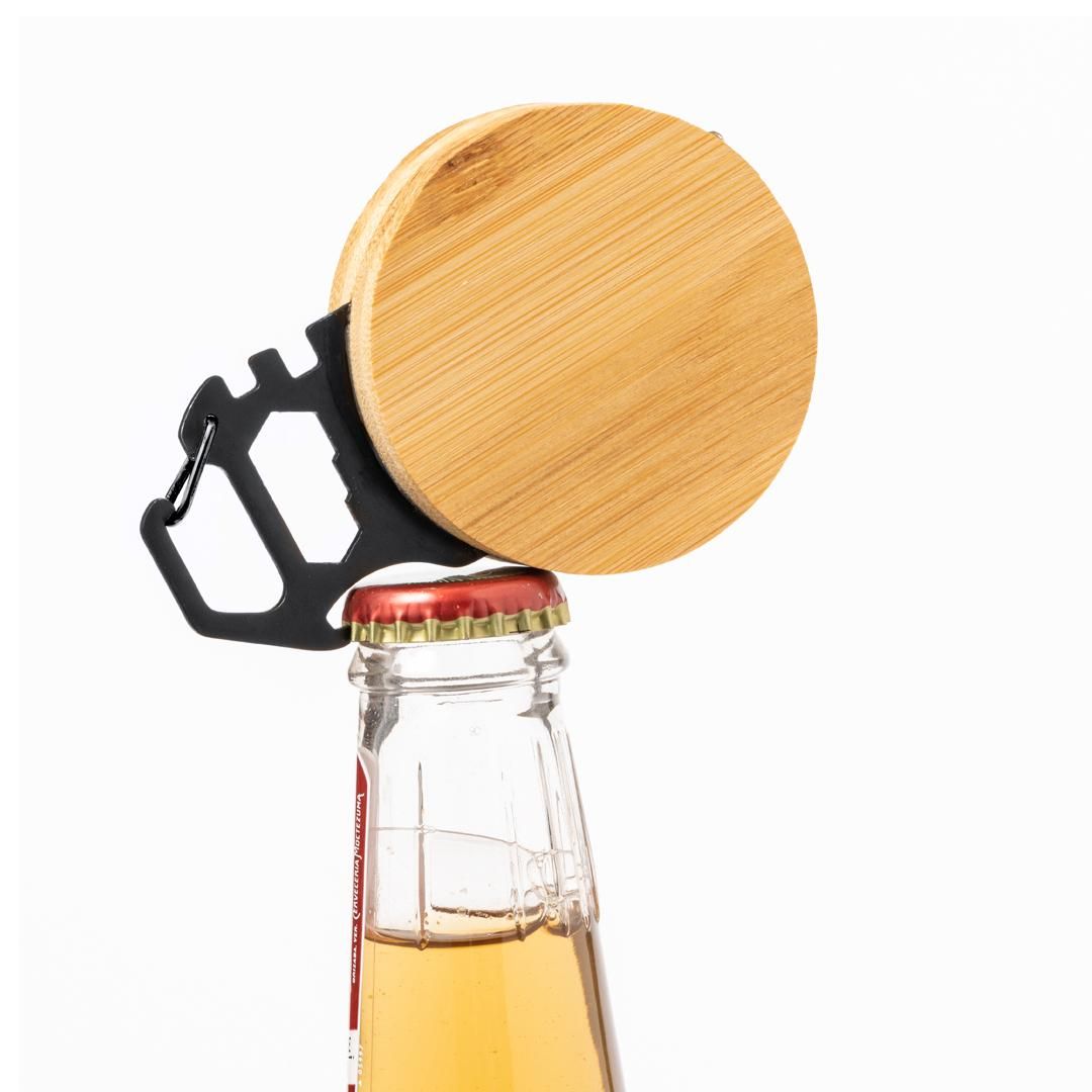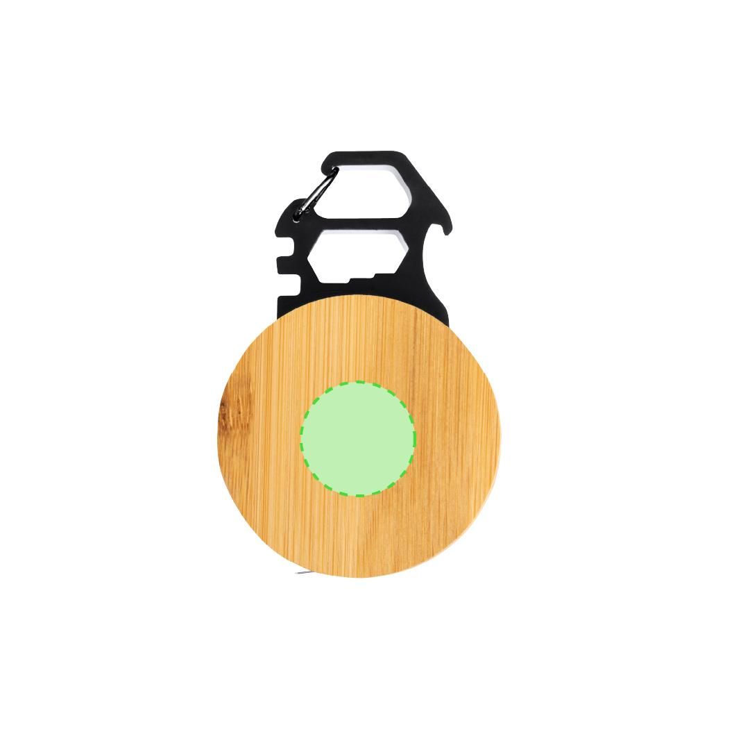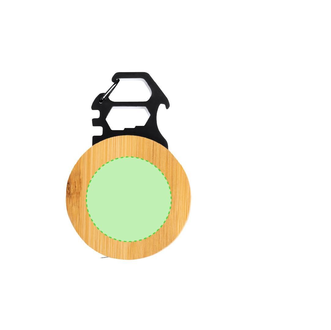 Multiherramienta con 7 funciones, fabricada en acero inox y bambú. Incluye un metro con medidas en centí metros y pulgadas (longitud de 1 metro), una llave para tuercas hexagonales en varios tamaños y un abridor. Además, cuenta con un mosquetón para facilitar el transporte. Presentada en caja de diseño kraft.Materiales como el bambú fomentan la utilización de materias primas naturales, reduciendo las emisiones contaminantes. Proviene de una planta de gran resistencia y versatilidad, con crecimiento y regeneración rápidos, siendo una excelente alternativa al uso de madera tradicional.