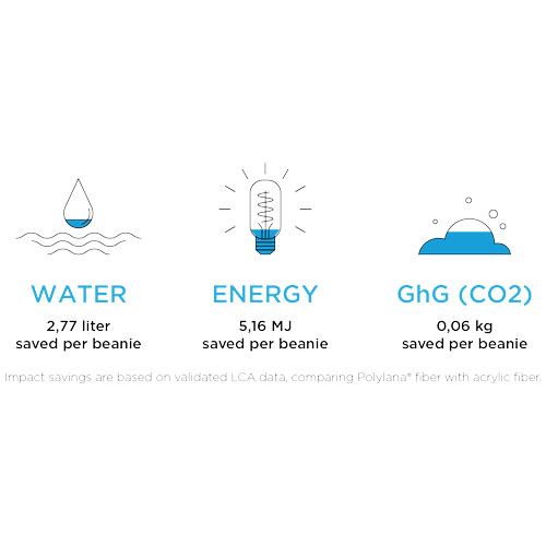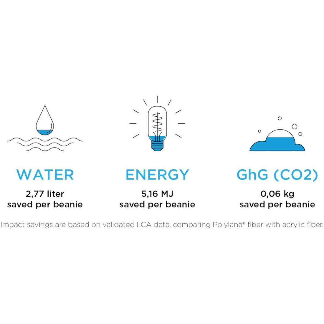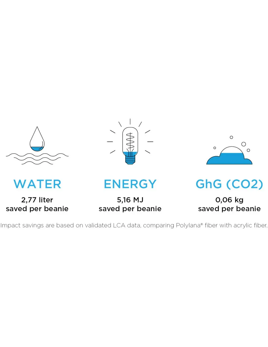 El gorro Hale está fabricado en fibra Polylana® -una alternativa de bajo impacto a las fibras 100% acrílicas y de lana- que permite ahorrar agua y energía así como reducir la emisión de CO2 durante el proceso de producción y teñido. En comparación con la fibra acrílica, por cada gorro Hale se ahorran los siguientes impactos: 2,77 litros de agua, 5,16 MJ de energía y 0,06 kg de GhG (CO2), este ahorro se basa en datos validados del Análisis del Ciclo de Vida (ACV). Fabricado en punto de canalé 1x1 con fibra Polylana® y acrílico con una densidad de galga 12. La elección ideal para quienes valoran la moda cuidando el medio ambiente.