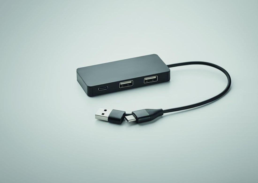 Hub de aluminio reciclado. Salida: 2 x Tipo-A y 1 x Tipo-C. Entrada: 2 en 1 Tipo-C y Tipo-A. Longitud del cable: 20 cm