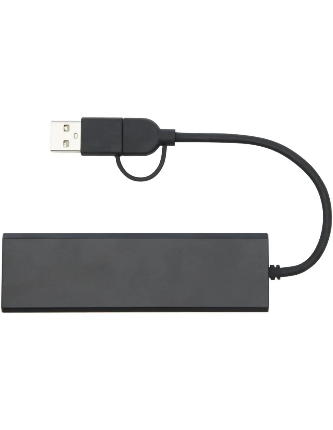 Hub USB 2.0 fabricado con aluminio reciclado con certificación RCS con una elegante carcasa rectangular de aluminio reciclado. Cuenta con 3 puertos USB 2.0 y 1 puerto tipo C de suministro de energía (PD) que permite transferir datos con una velocidad de hasta 480 Mbps. El adaptador de entrada tipo C incluido permite utilizar este dispositivo con portátiles y ordenadores equipados con conexión USB de tipo A y C. Se entrega en una caja de papel kraft 100 % reciclado con una pegatina de colores.