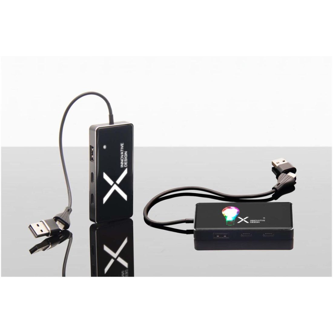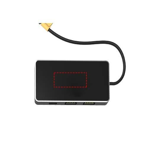 Hub USB 8 en 1 con 3 puertos USB-A y 3 puertos tipo C para conectar hasta 6 dispositivos al mismo tiempo. Gracias a su doble entrada USB-A y USB-C, es 100 % compatible con los ordenadores más recientes del mercado (USB-C). Este hub USB tiene un acabado de caucho y un logotipo luminoso. Se presenta en una caja de regalo de cartón reciclado (14,6 × 7,3 × 2,5 cm).