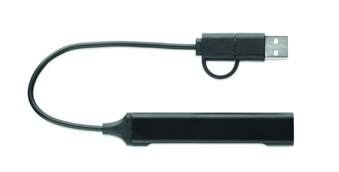 Hub USB de 4 puertos en aluminio reciclado. 3 USB-A + 1 Tipo-C. Entrada: 2 en 1 Tipo-C y Tipo-A. Longitud del cable: 19 cm.
