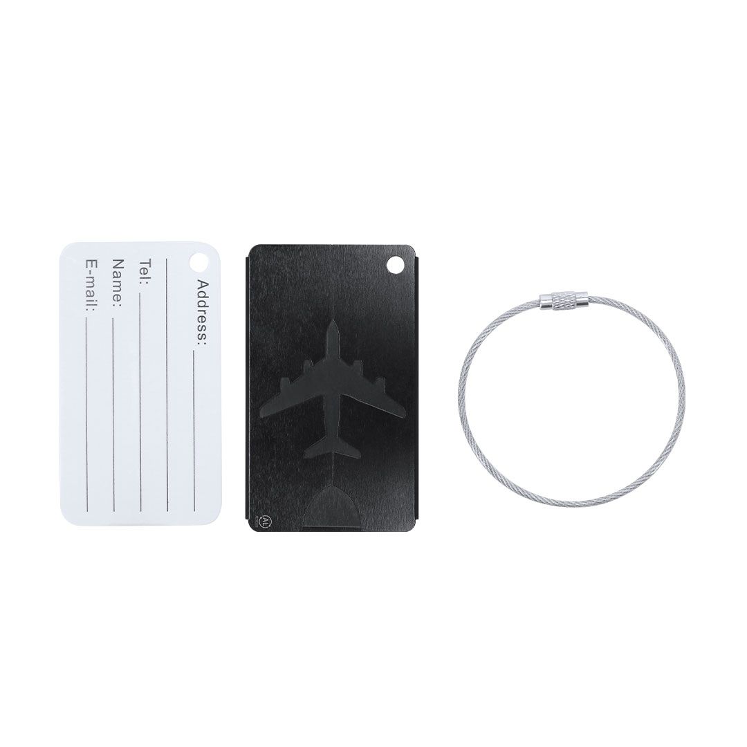 Original identificador de maletas con diseño de avión en resistente Aluminio Reciclado. Con cinta de acople en acero inoxidable con sistema de cierra en rosca y tarjeta de identificación en inglés con los siguientes campos impresos; Addres, Tel, Name, E-mail. Logo AL Recycled grabado por láser.