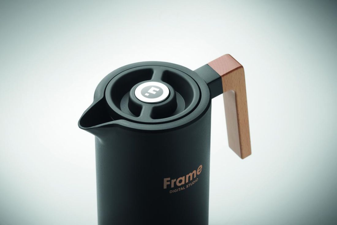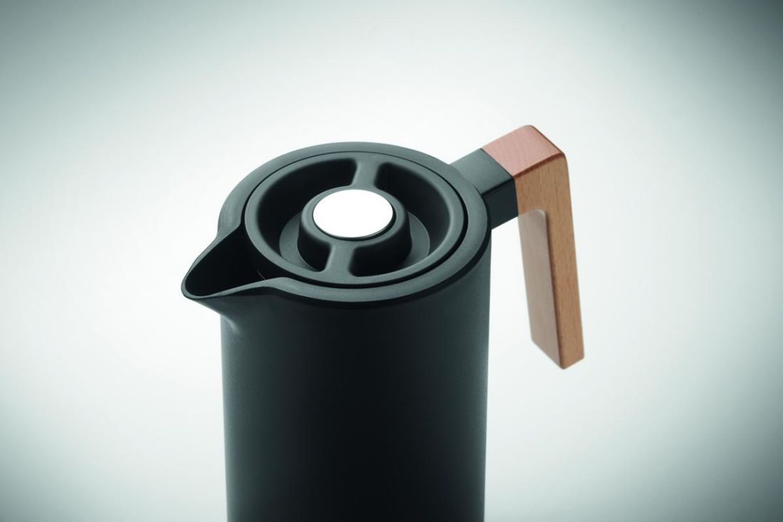 Jarra con doble pared aislante, fabricada en acero inoxidable reciclado (90 % acero inoxidable reciclado y 10 % acero inoxidable) en el interior y PP en el exterior, con asa de madera. Capacidad: 1 l.