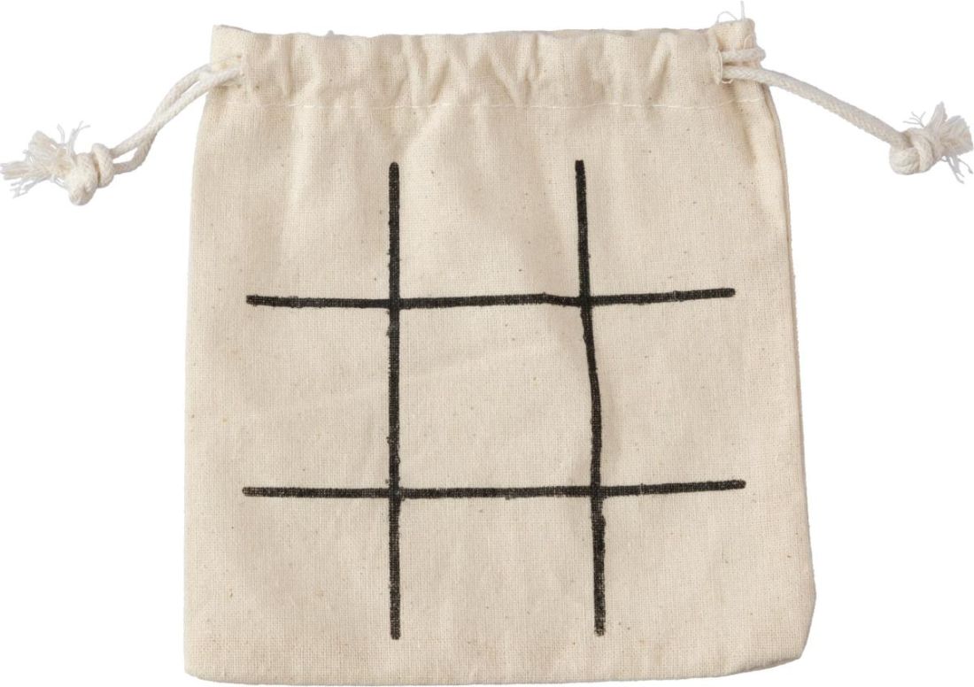 Juego 3 en raya de madera natural. Incluye 10 pequeñas piezas. Presentado en una bolsa de algodón.