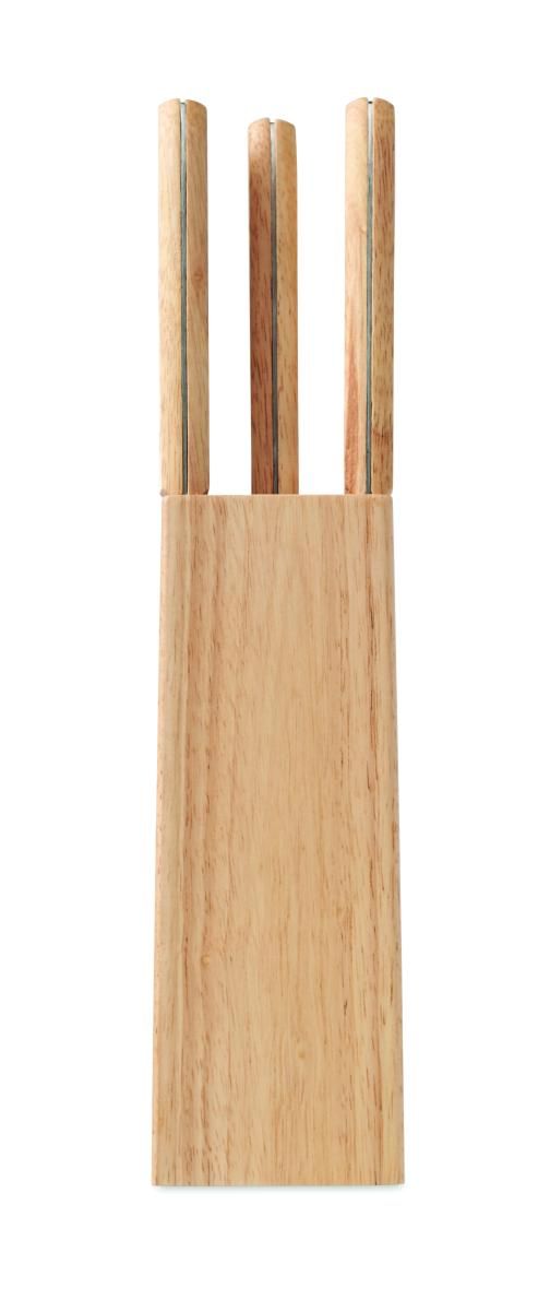 Juego de cuchillos de madera. Incluye soporte de base y 5 cuchillos: para Chef, de pan, rebanador, multifuncional y pelador. Acero inoxidable con mango de madera.