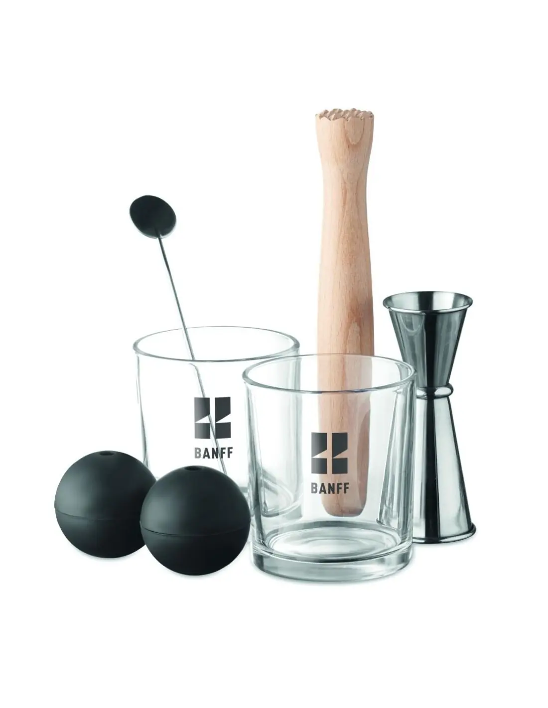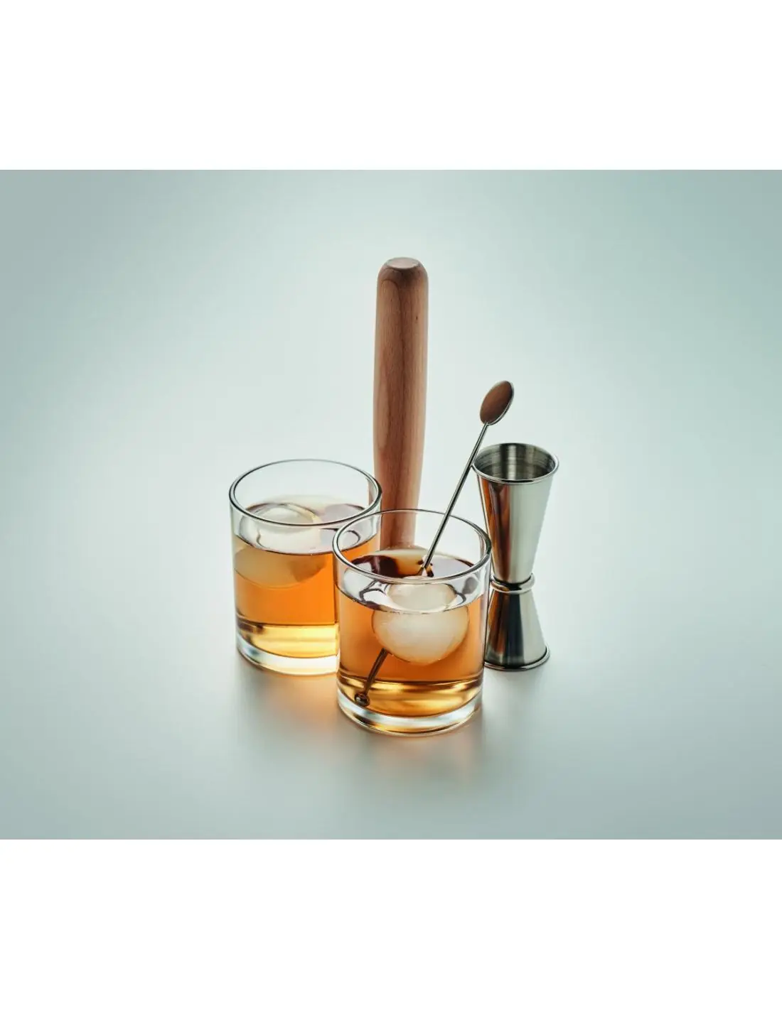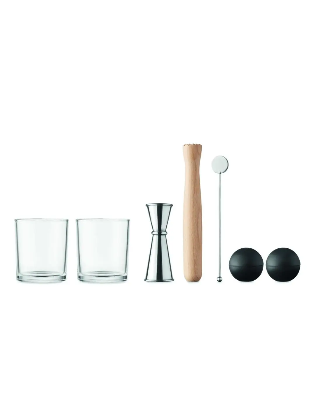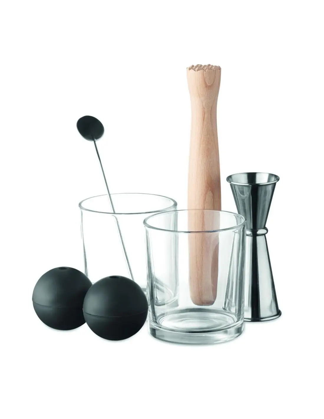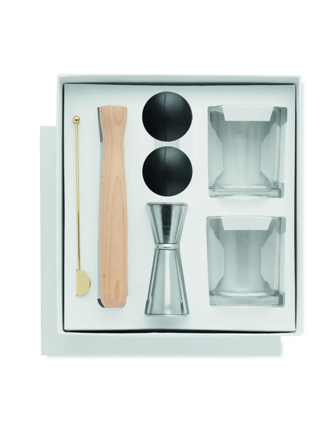 Juego de vasos de cóctel. Incluye 7 piezas: dos vasos, dosificador de acero inoxidable de doble uso (25 y 50 ml), mortero de madera, agitador de bebidas de acero inoxidable y dos moldes de silicona para hielo.