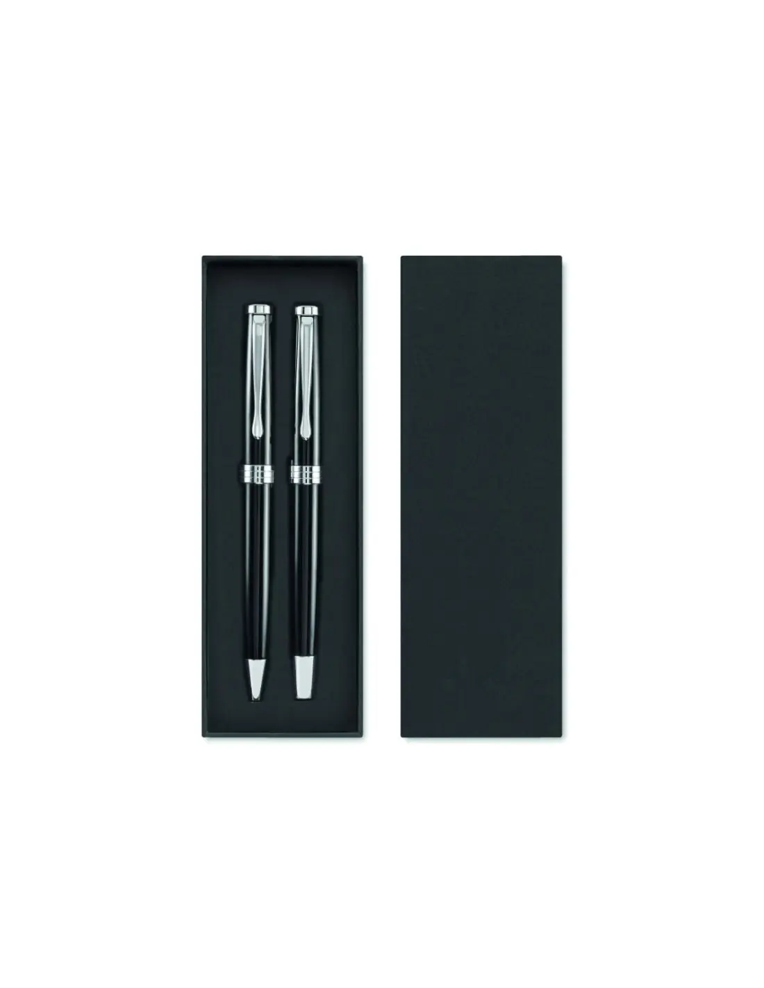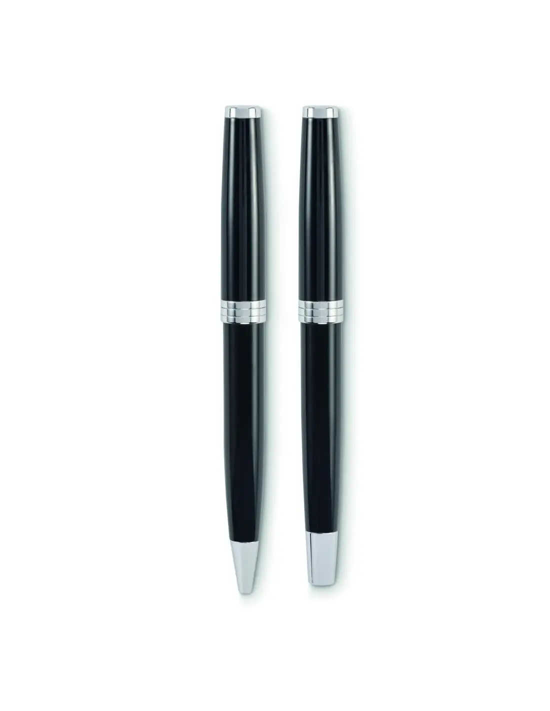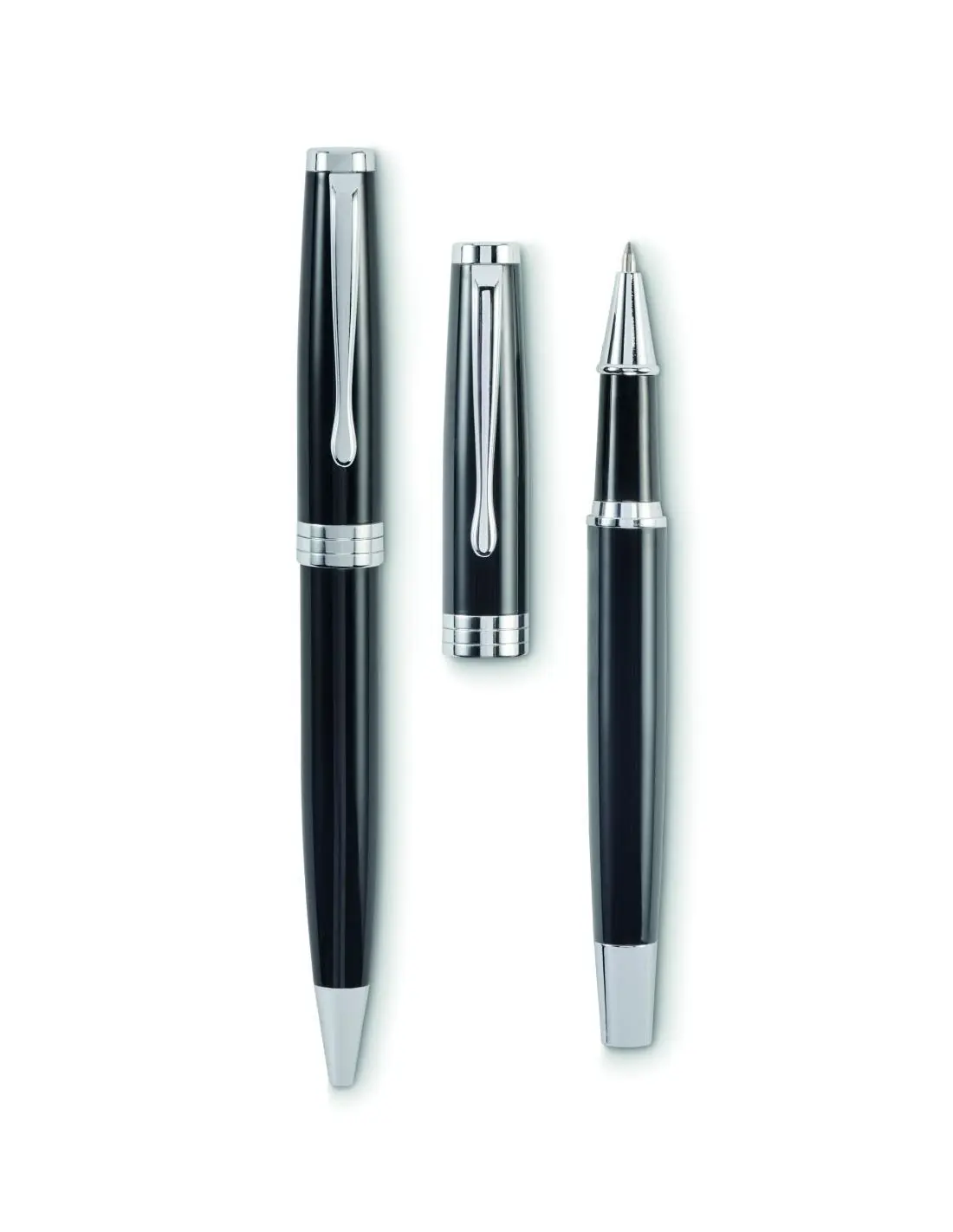 Set de bolígrafo y roller con cuerpo de acero inoxidable reciclado. Tinta azul y negra respectivamente. Presentado en estuche.