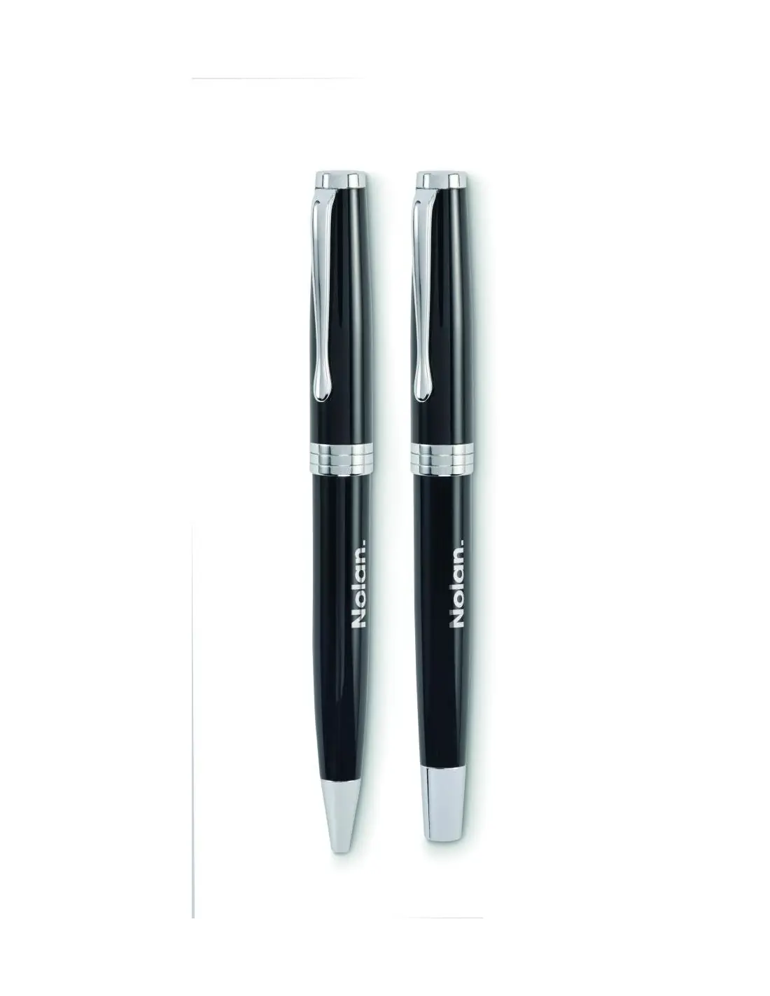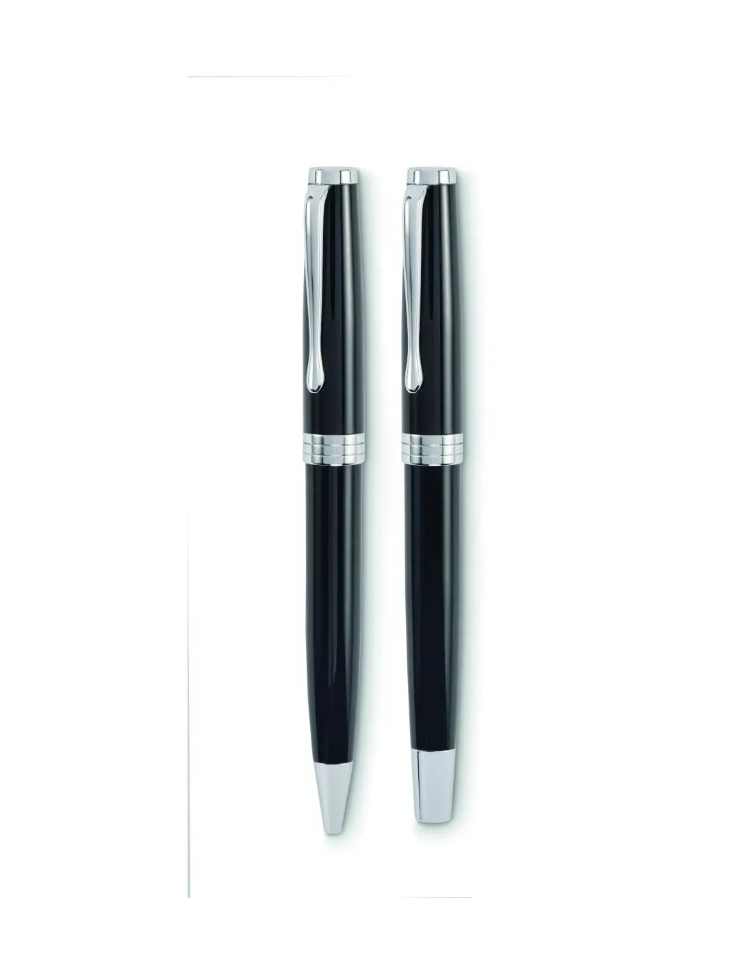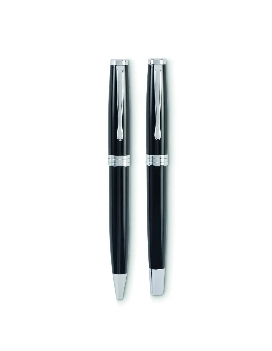 Set de bolígrafo y roller con cuerpo de acero inoxidable reciclado. Tinta azul y negra respectivamente. Presentado en estuche.