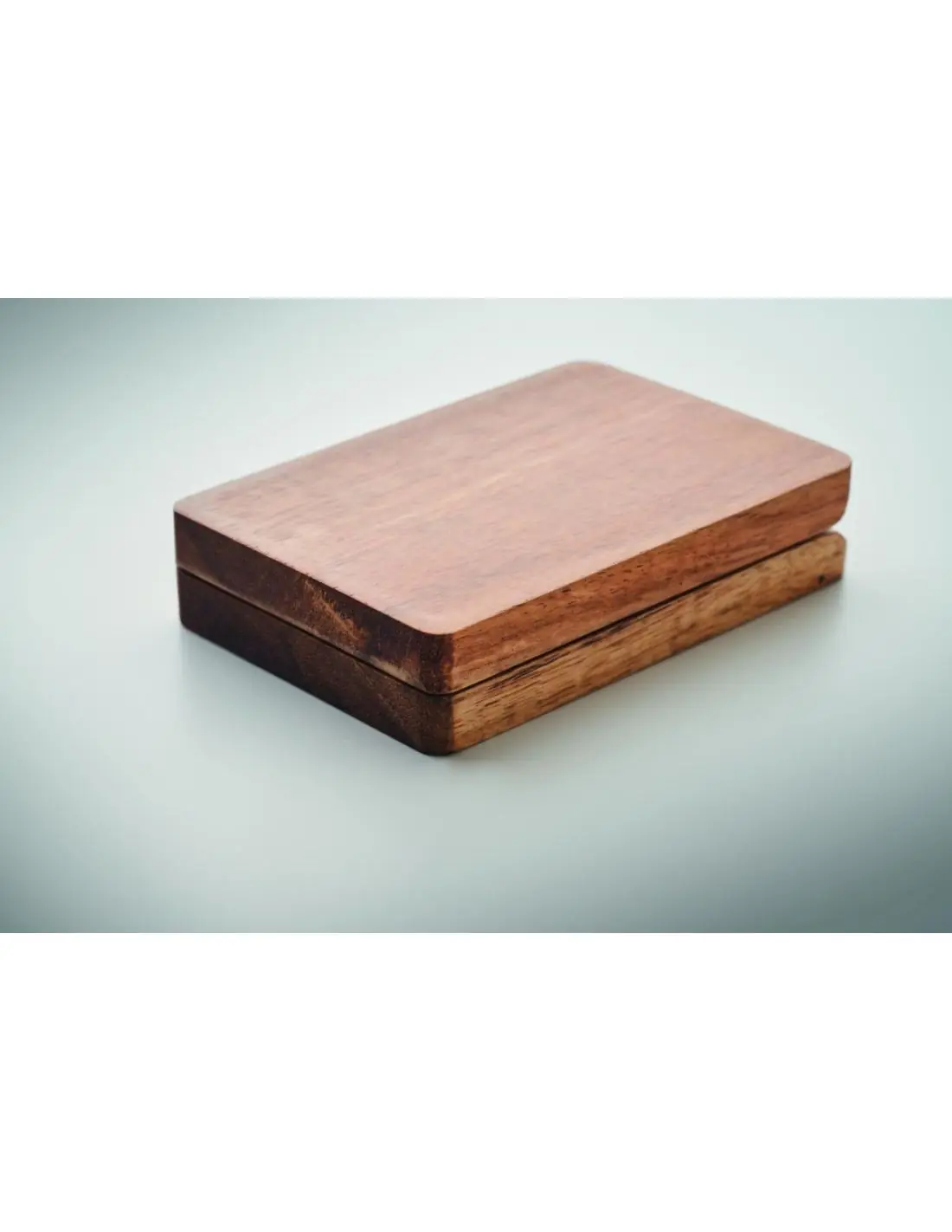 Cable de carga y transferencia de datos 3 en 1 con diferentes conectores. Presentado en caja de madera de acacia. Cable de tipo C a tipo C, de C a USB-A, de C a micro-B y de C a conectores Lightning.