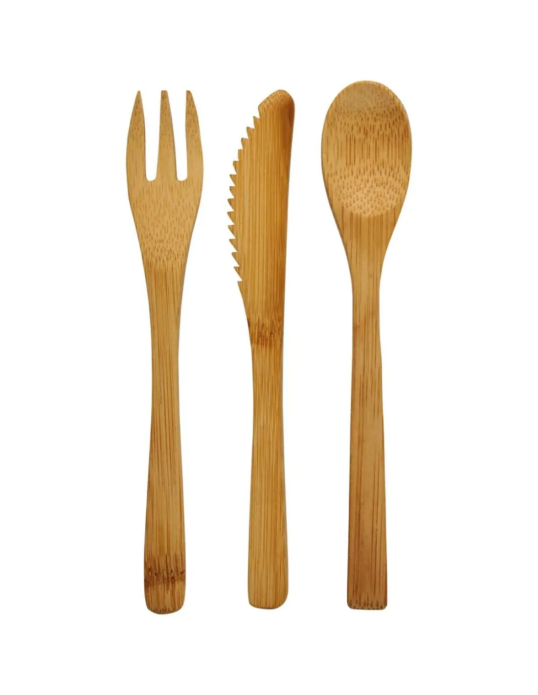 Juego de cubiertos de bambú compuesto por tenedor, cuchillo y cuchara. Viene en una bolsa no tejida.