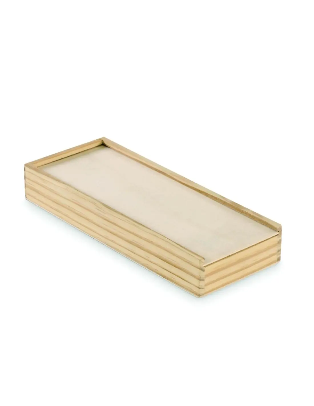 Juego de dominó de madera y cartas de papel reciclado. Presentado en caja de MDF.