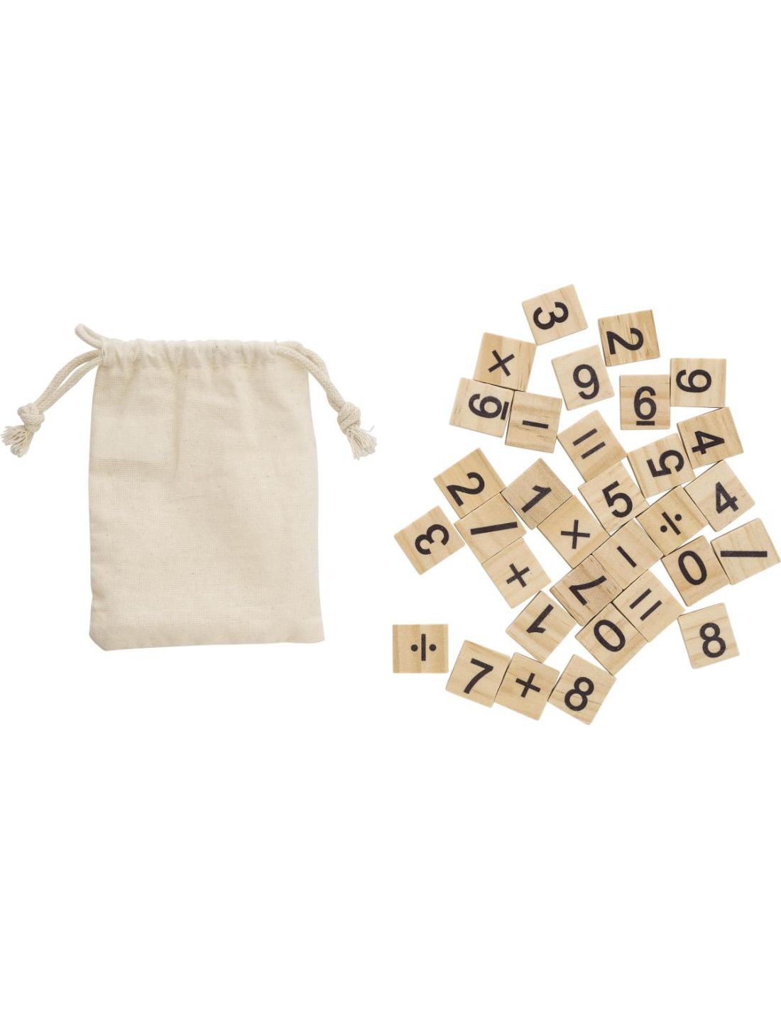 Juego educativo de madera de pino con 32 piezas para realizar cálculos. Presentado en una bolsa de algodón con cordón.