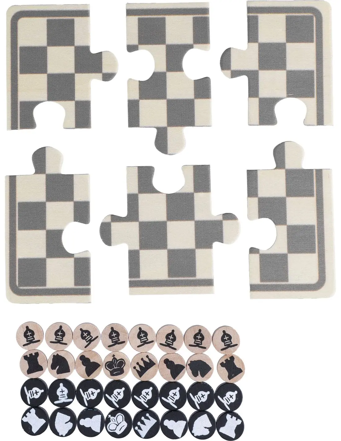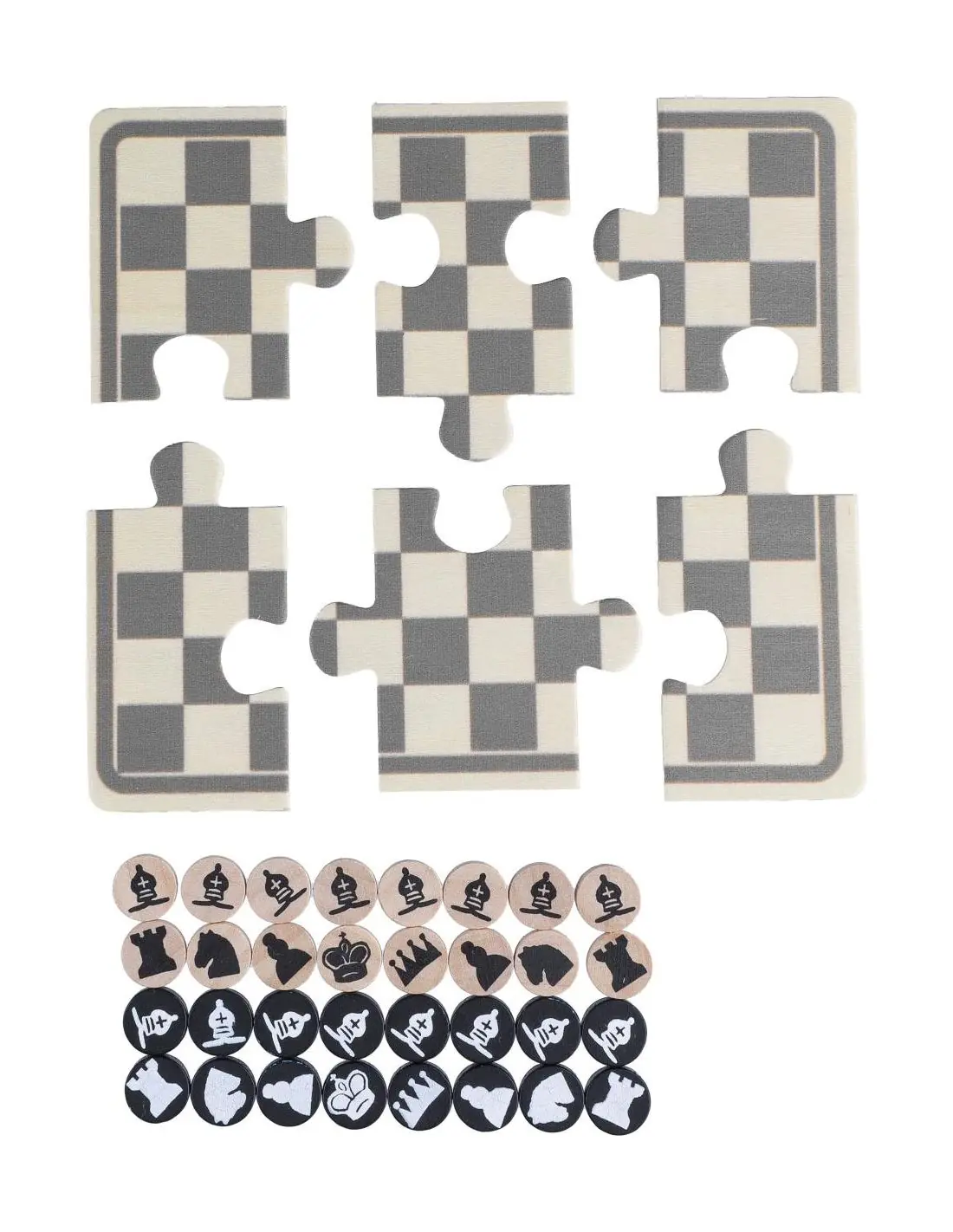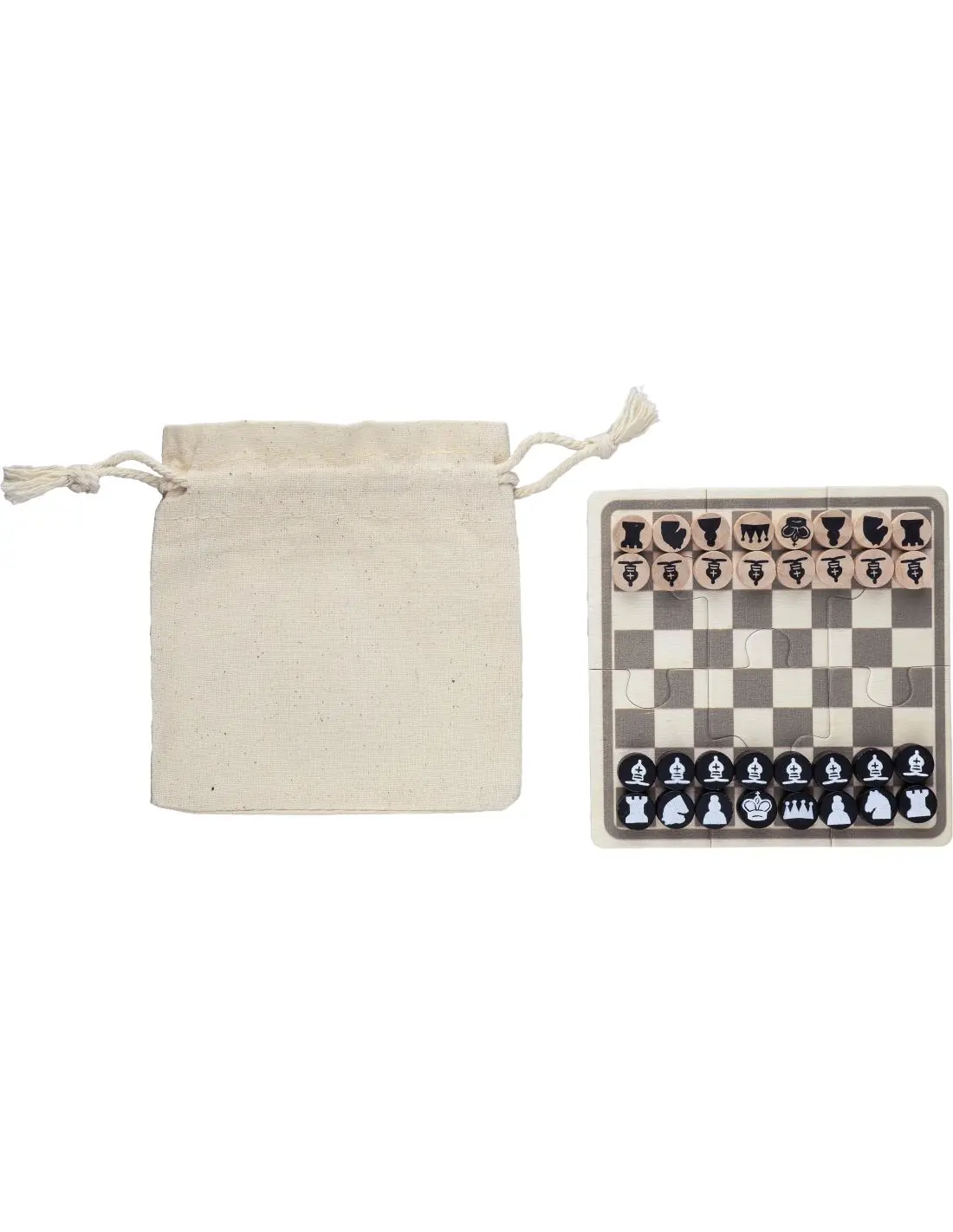 Juego de ajedrez y damas de madera en una bolsa de algodón con cordón. Incluye un rompecabezas impreso de 6 piezas (campo de juego negro/natural) para montar los tableros de juego y 16 fichas de madera impresas con diseños de figuras de ajedrez. Las fichas de madera vienen en colores natural y negro. Incluye instrucciones de juego. Etiqueta dentro de la bolsa. El campo de juego está hecho de polímero de madera y las fichas de madera de pino.