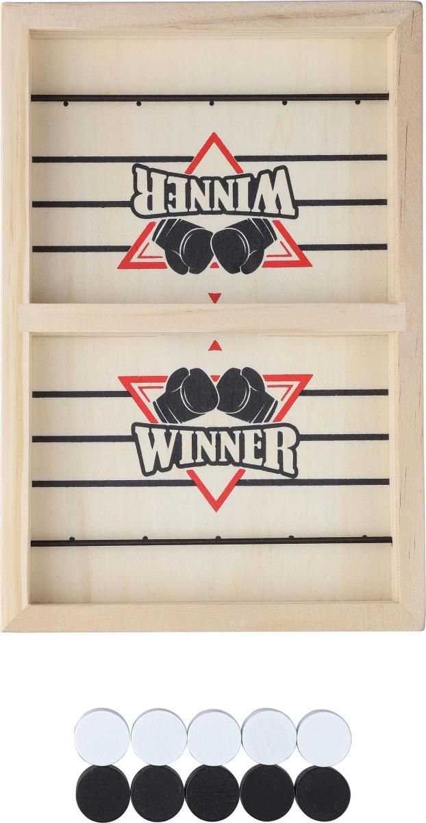 Juego de expulsión de madera. Incluye 10 fichas de ajedrez (5 blancas y 5 negras) y un manual para facilitar la configuración y el juego. Un juego de habilidad trepidante para adultos con un total de 11 piezas. Presentado en una caja de cartón marrón con portada ilustrada.