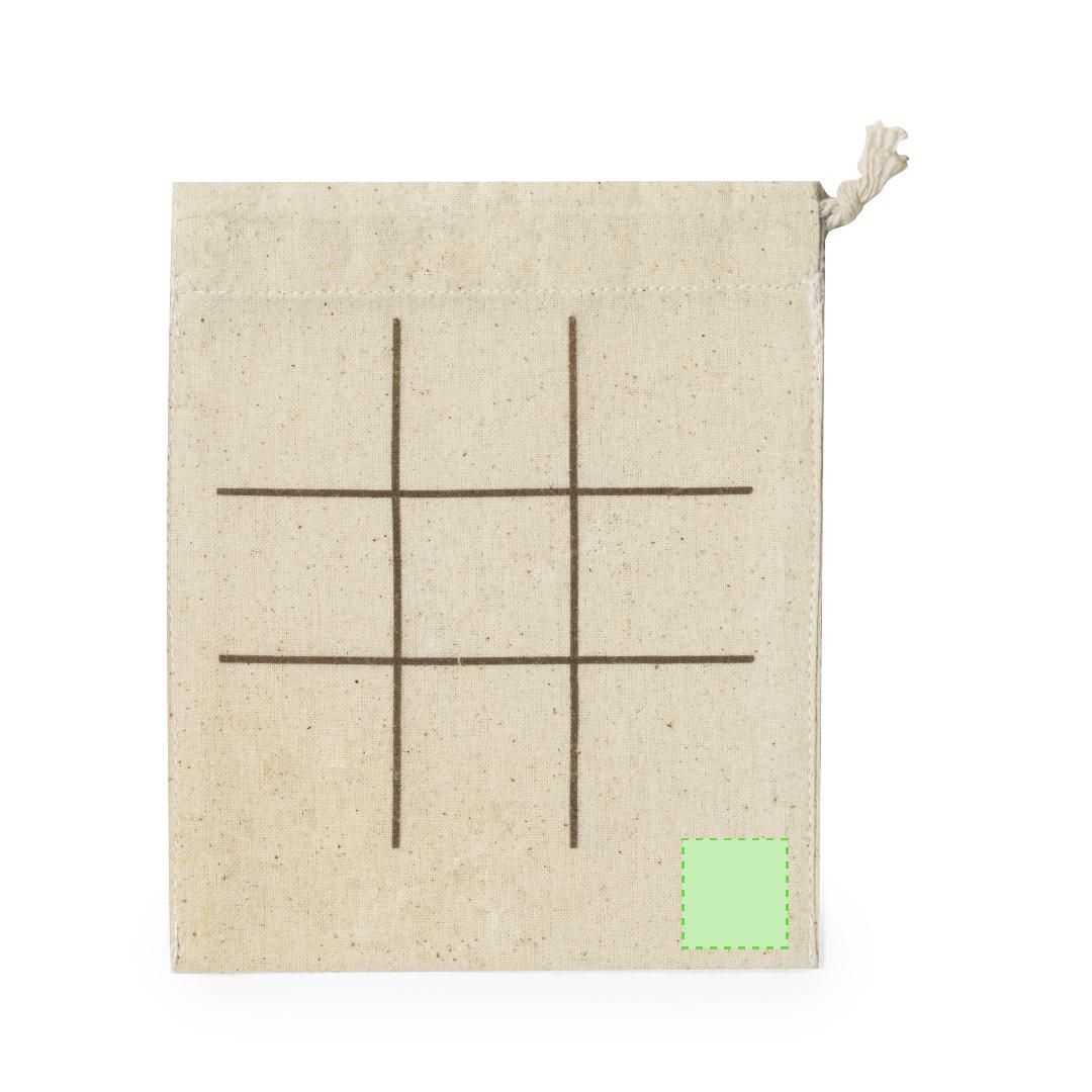 Juego tres en raya fabricado en corcho natural. Incluidas 5 fichas circulares y 5 fichas en cruz. Presentado en bolsa de algodón con cierre de cordón...