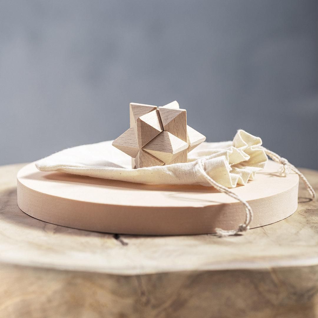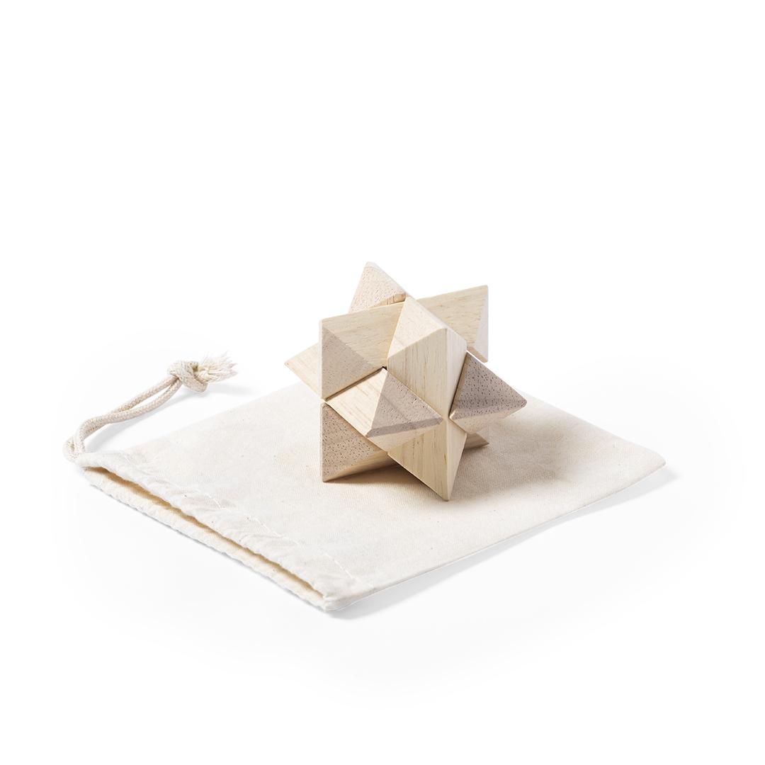 Juego de habilidad de 6 piezas para los más sesudos, presentado en una resistente funda de algodón con cierre de cordón.