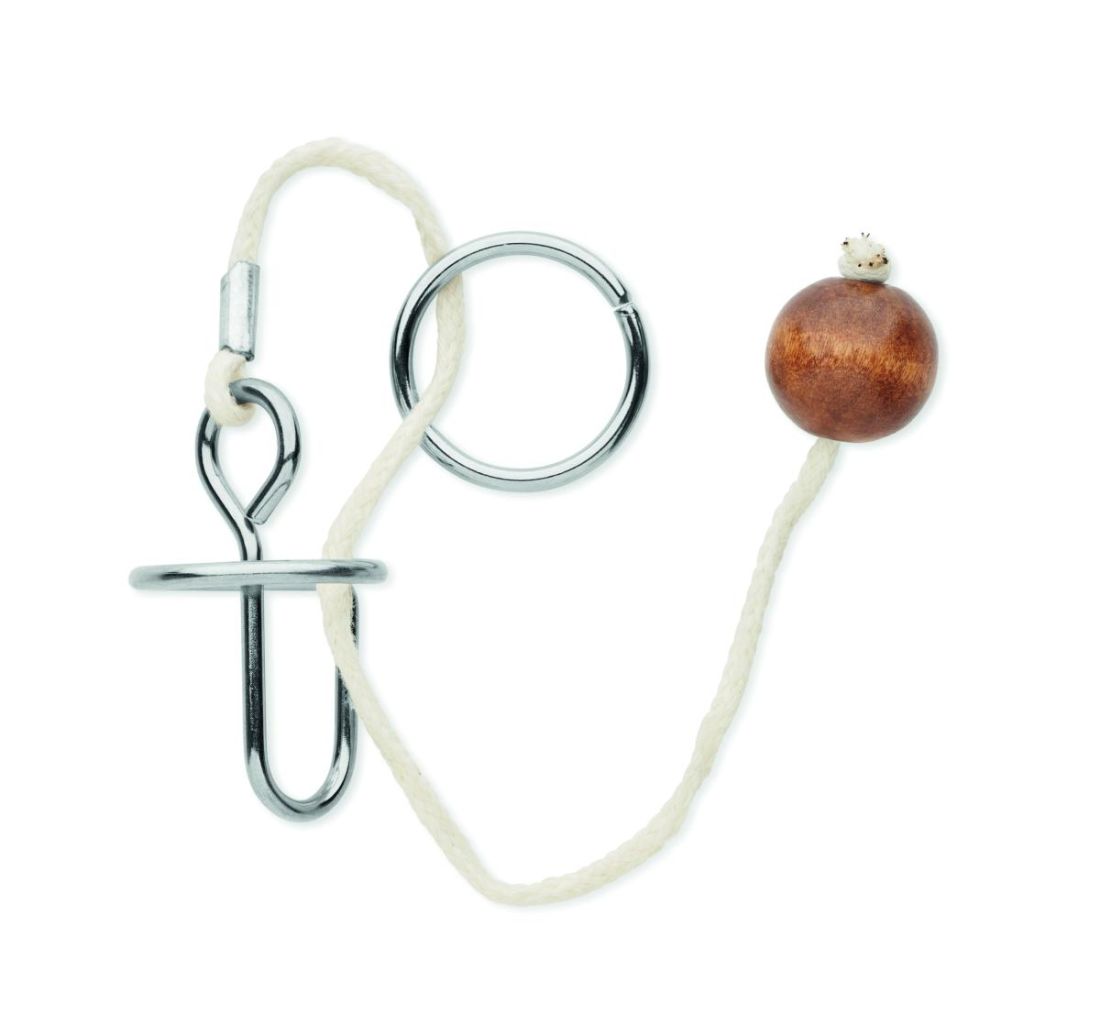 Juego de 2 rompecabezas de metal, madera y cuerda de algodón: 2 y 4 piezas respectivamente. Presentado en una caja de papel reciclado.