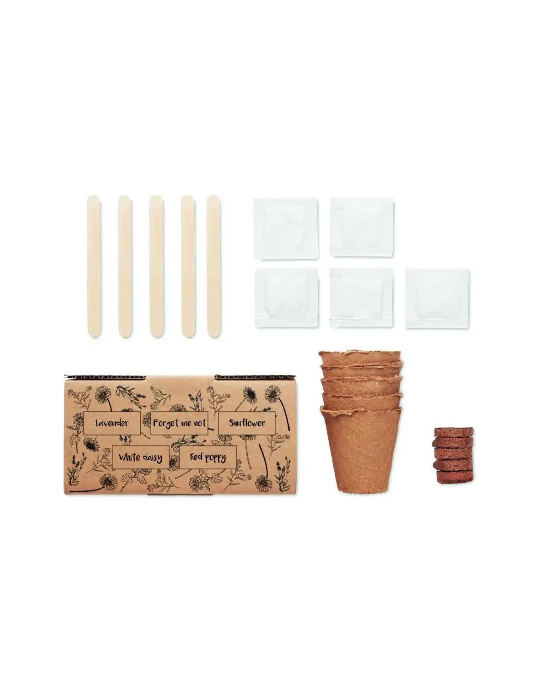 Kit de cultivo de flores. Caja con semillas de lavanda, no me olvides, girasol (Helianthus debilis), margarita blanca y amapola roja. Fabricado en la UE. Tableta de tierra incluida.
