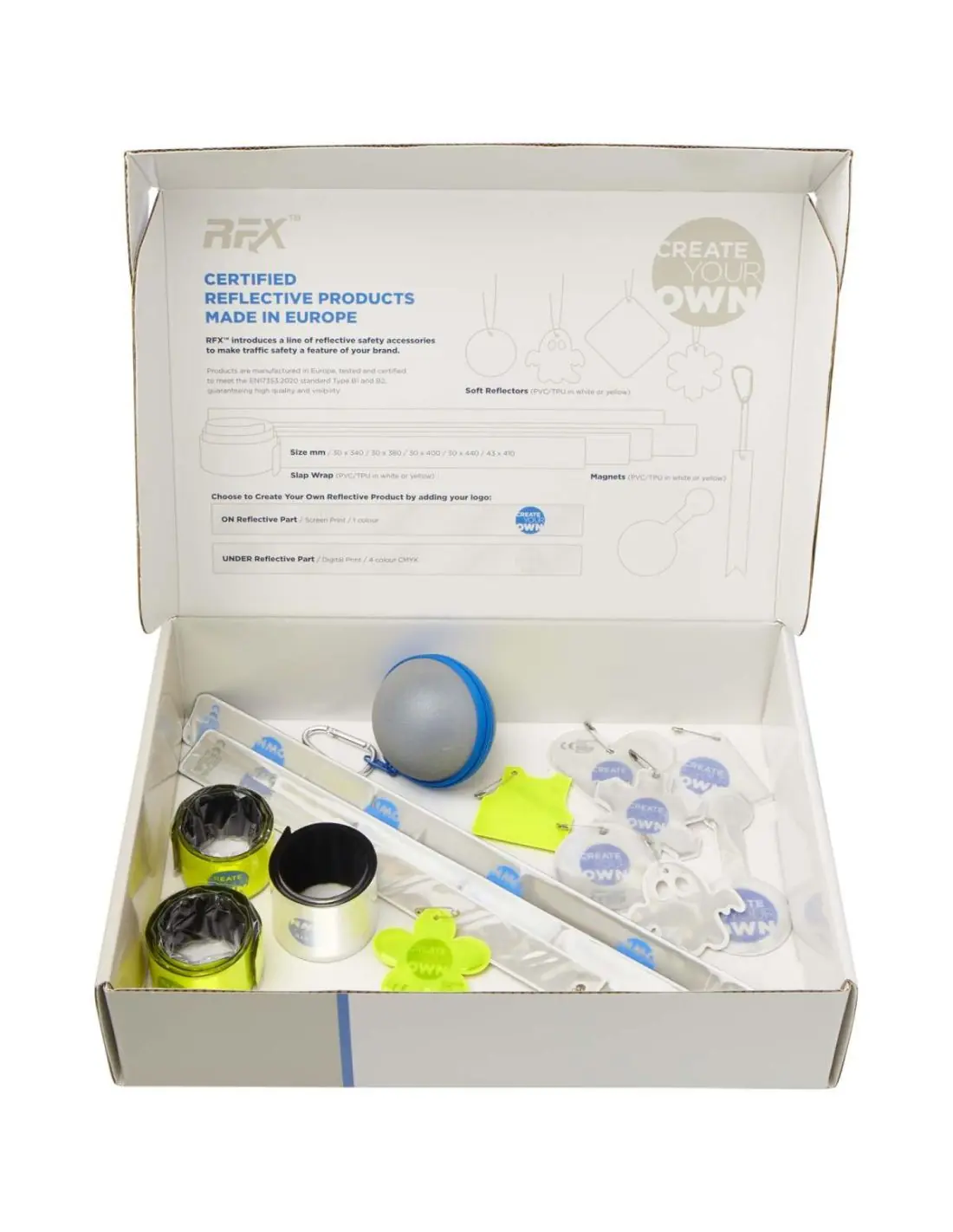 Incluye 5 pulseras , 8 colgadores reflectantes, 1 imán reflectante, 1 funda reflectante y 1 catálogo de productos reflectantes. Los productos se fabrican en Europa y se prueban y certifican para cumplir la norma EN17353:2020 tipo B1 y B2, que garantiza una alta calidad y visibilidad.