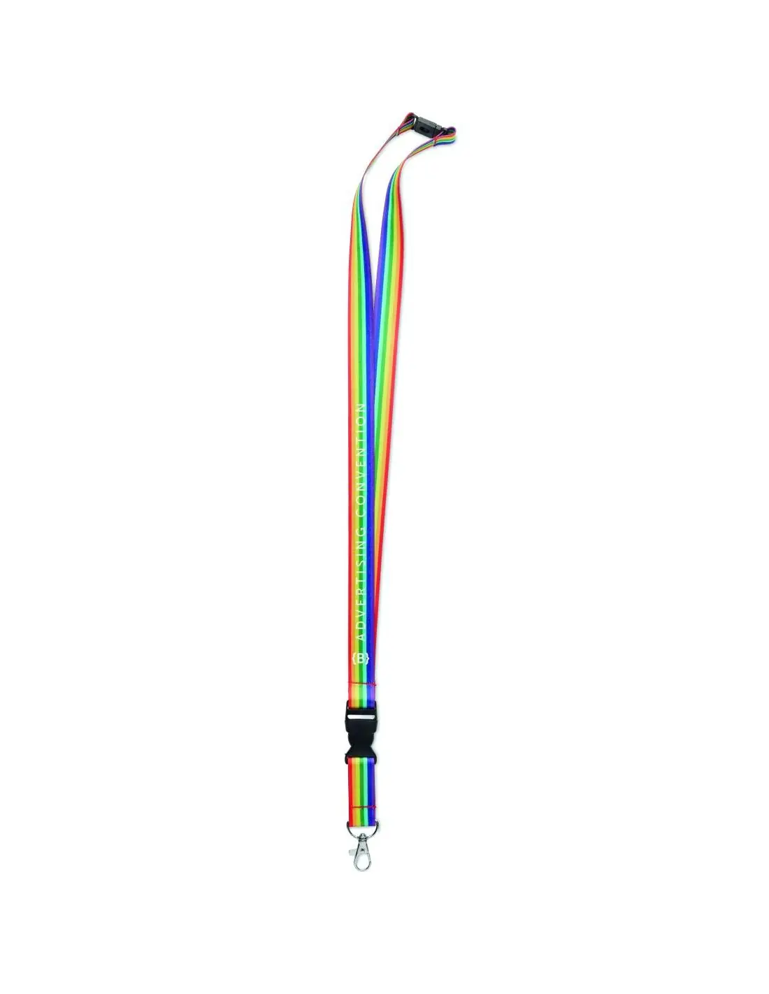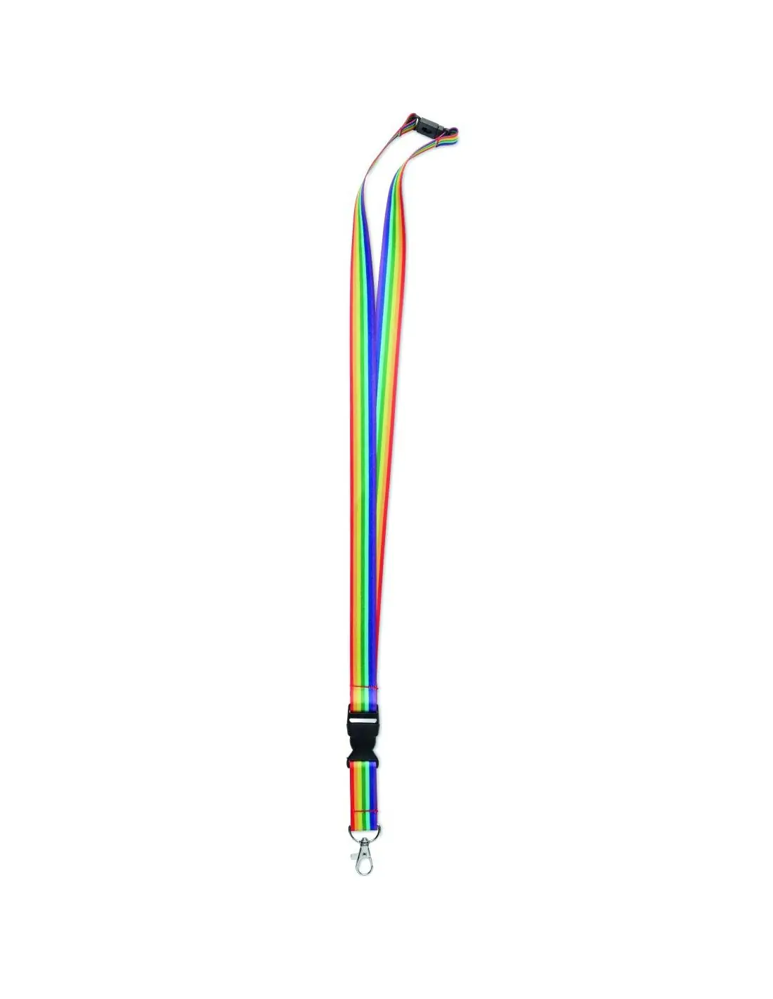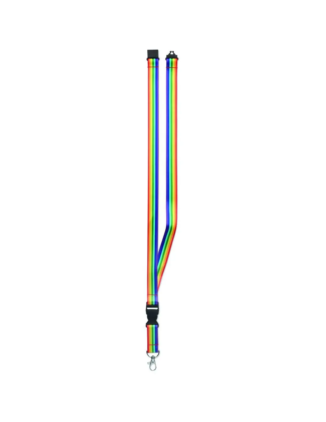 Lanyard rainbow de RPET con mosquetón metálico, hebilla desmontable y cierre de seguridad.