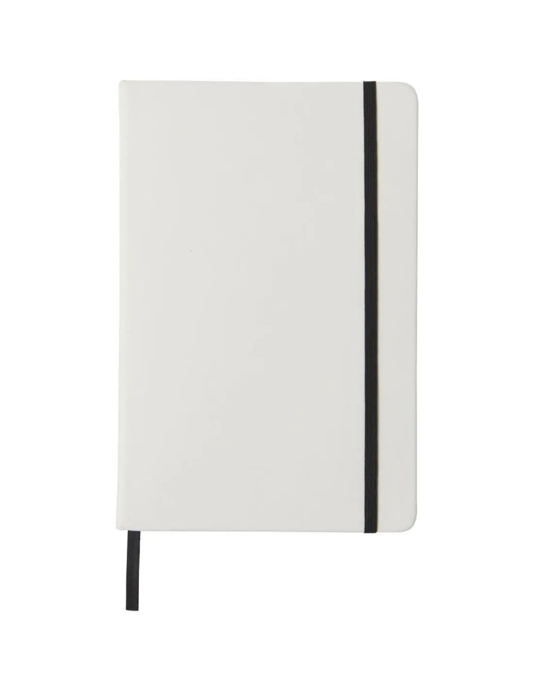 Libreta blanca A5 con cierre elástico de color y cinta. Incluye 80 hojas (60g / m2) de papel rayado. Impresión digital posible en la portada.