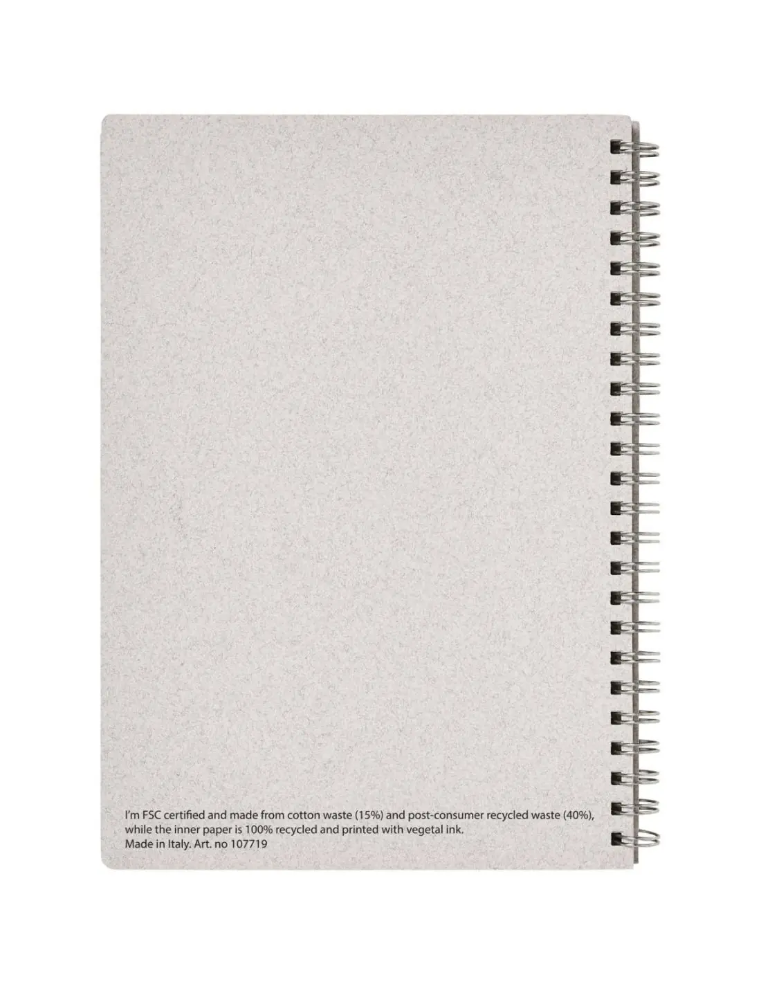 Libreta A5 con espiral fabricada con materiales de origen responsable que contienen residuos de algodón (15%) y residuos reciclados postconsumo (40%) en las cubiertas. Incluye 80 hojas de papel...