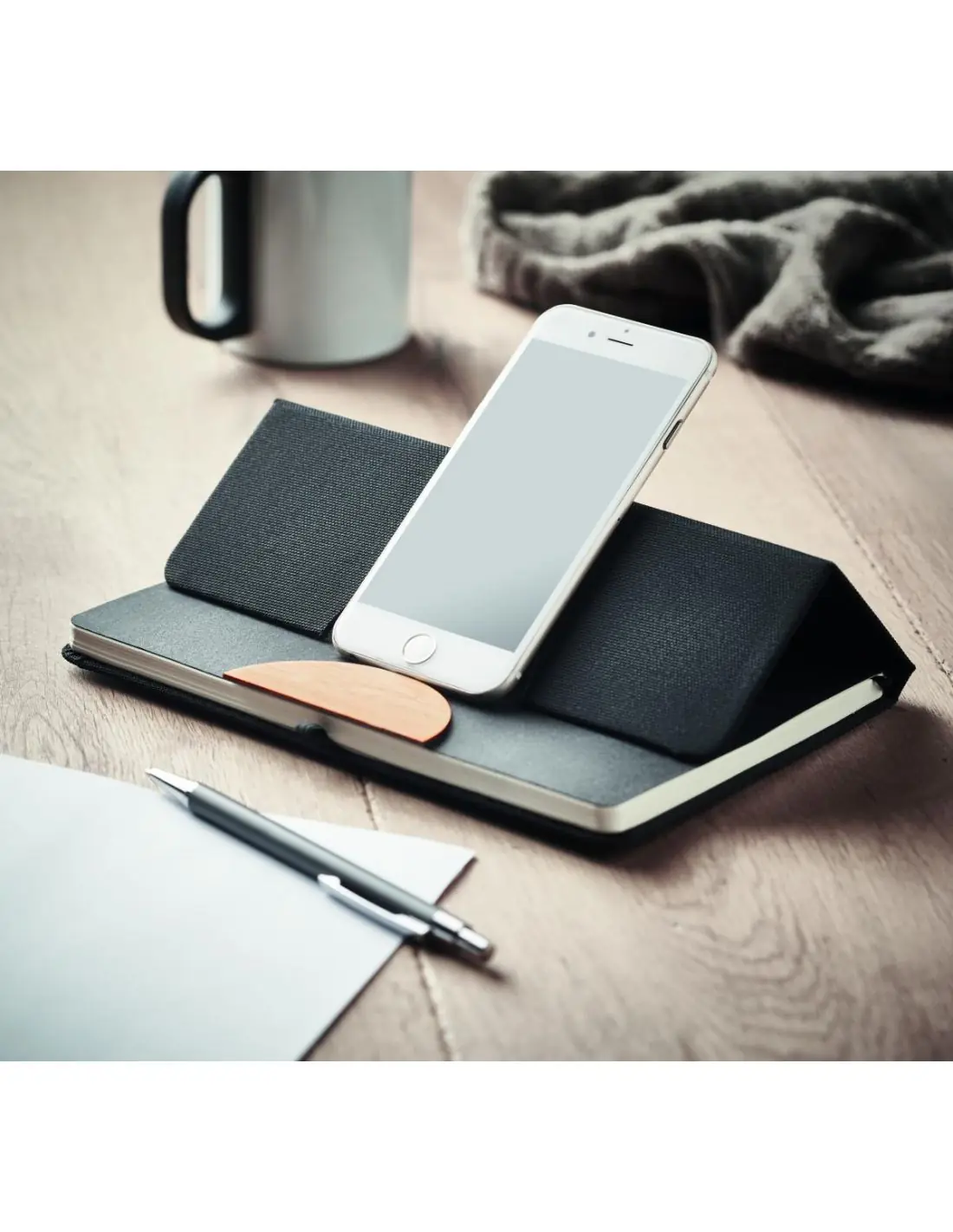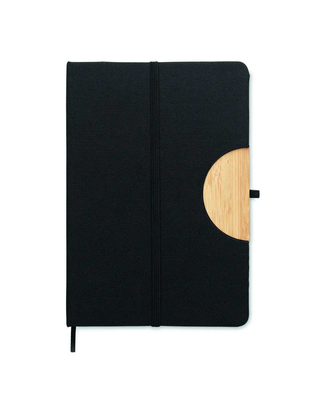 Libreta A5 con tapa dura de RPET 600D con detalle de bambú con función de soporte para smartphone. Encuadernado en caja. 160 páginas rayadas (80 hojas). Papel reciclado de 70 g/m². Banda elástica a juego, marca páginas y porta bolígrafos. Llévate este elemento esencial para la oficina a tu próxima reunión. ¿Tienes una reunión a distancia? Abre el soporte del teléfono y coloca tu dispositivo para no tener que sujetarlo tú mismo. FSC®-certified | FSC MIX CREDIT, P7.1, FSC-C213206