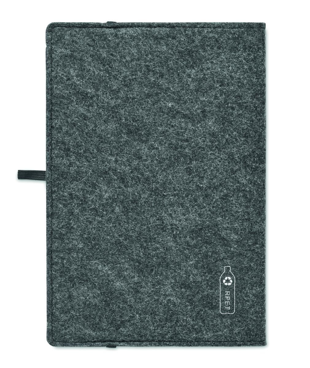 Libreta A5 con cubierta de fieltro RPET. 160 páginas rayadas de papel reciclado (80 hojas / 70 gr/m²). Porta bolígrafos.