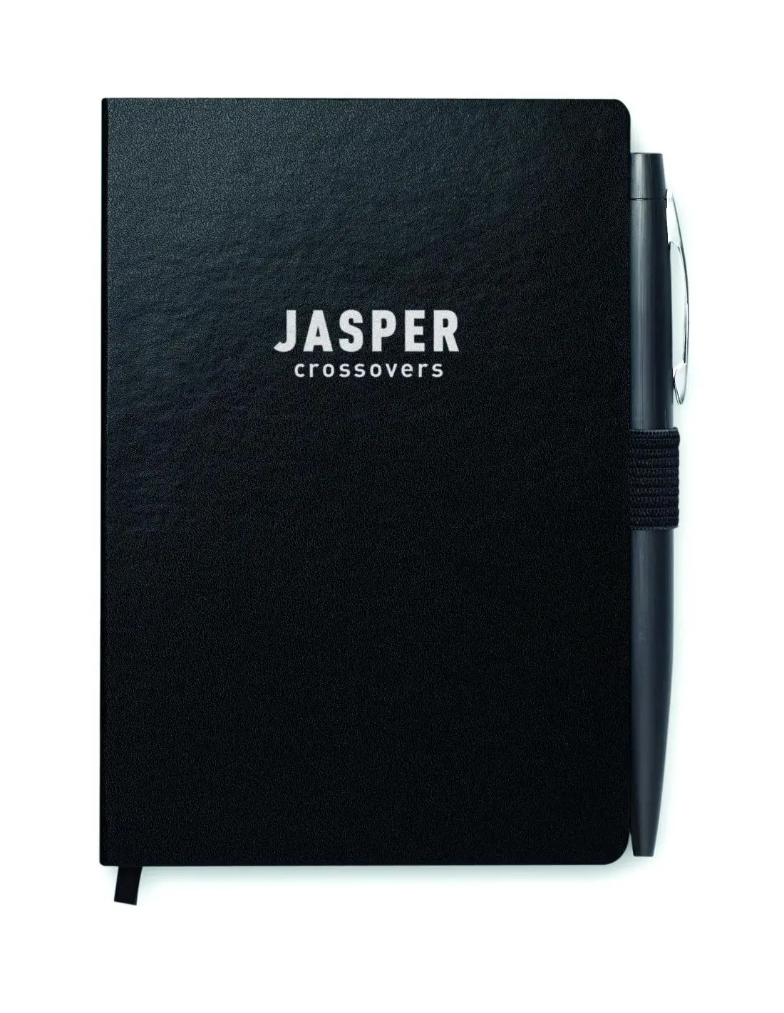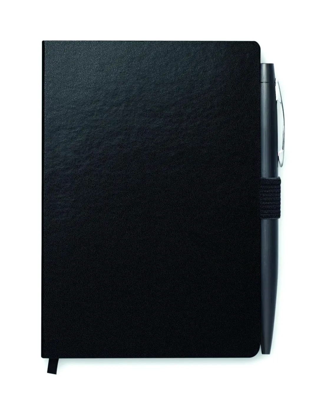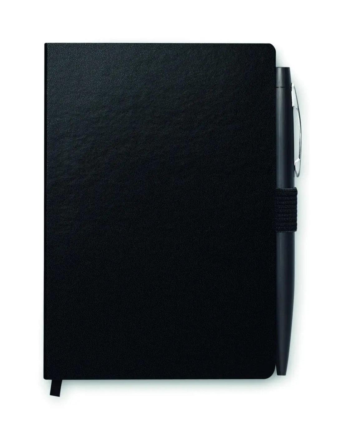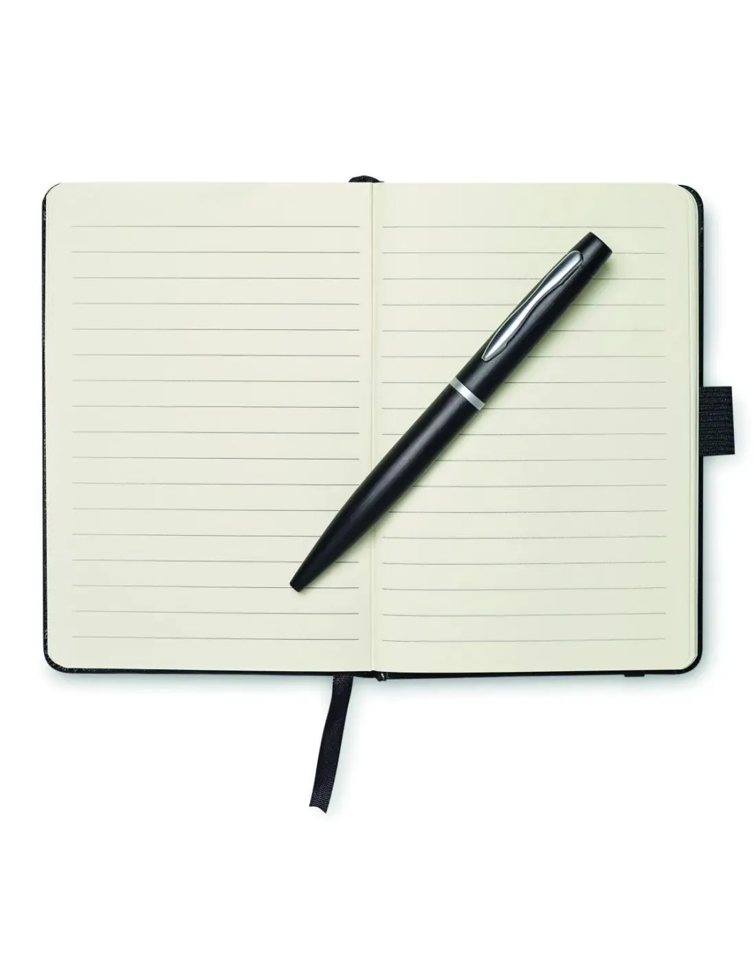 Libreta A6 con tapa rígida. 72 hojas rayadas. Banda elástica y marca páginas. Incluye bolígrafo con tinta azul. FSC MIX CREDIT | P7.1 | FSC-C213206