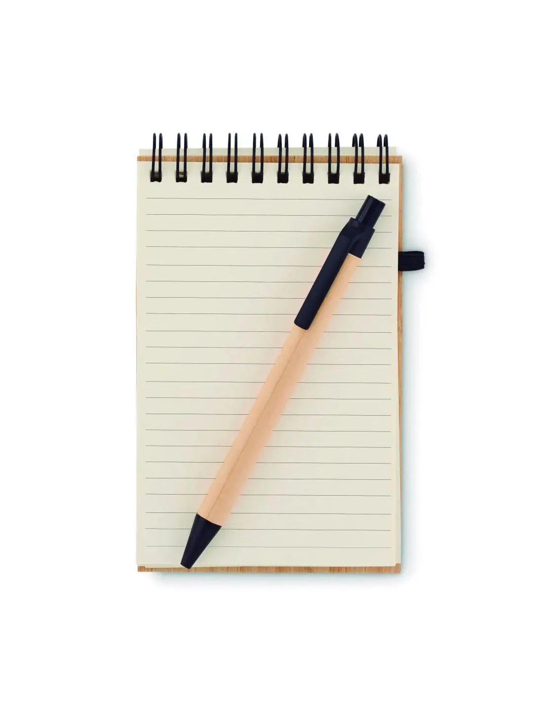 Libreta A6 con tapa de bambú con 70 hojas rayadas de papel reciclado. Incluye un bolígrafo reciclado a juego con punta y clip de PLA. Tinta azul. F…