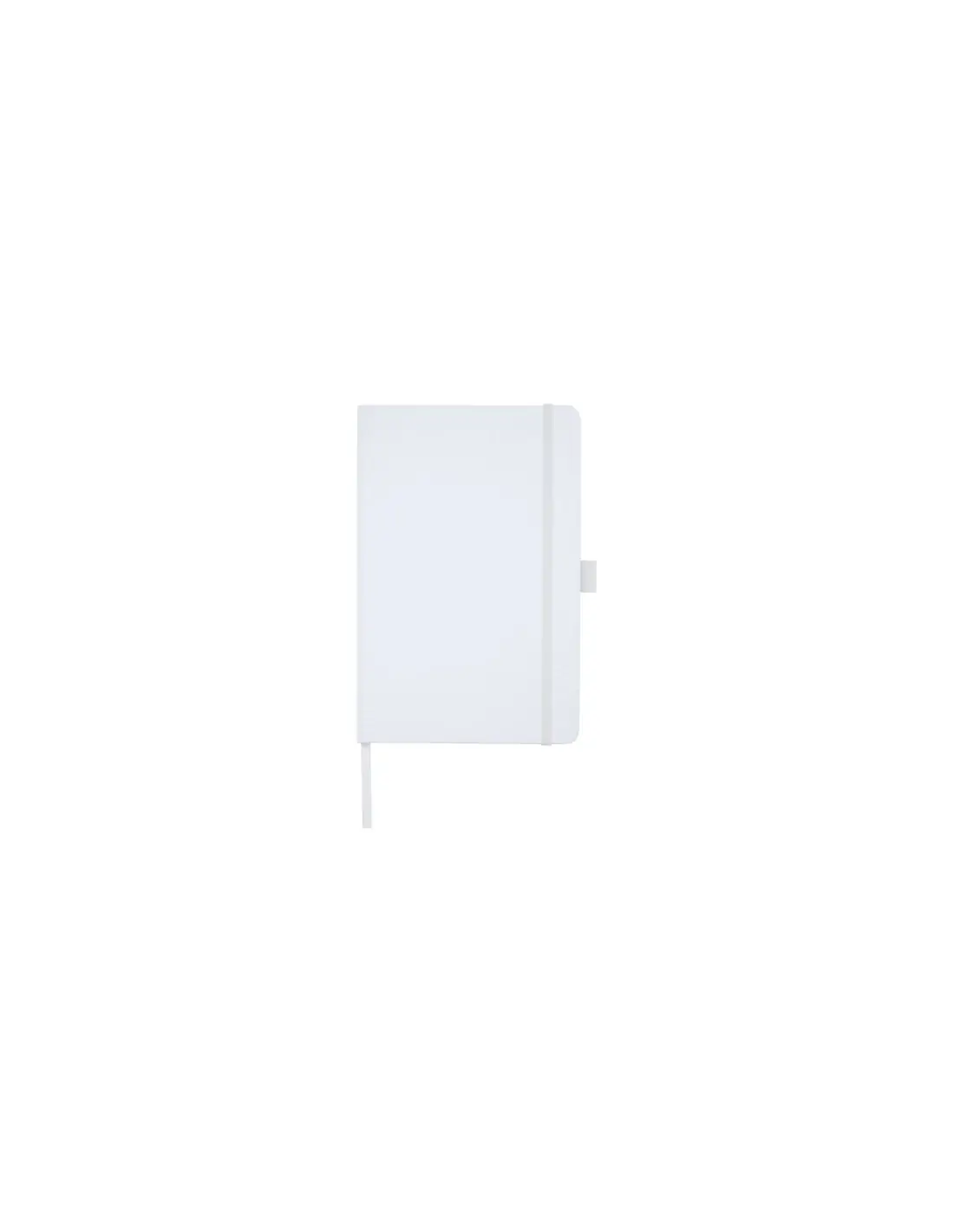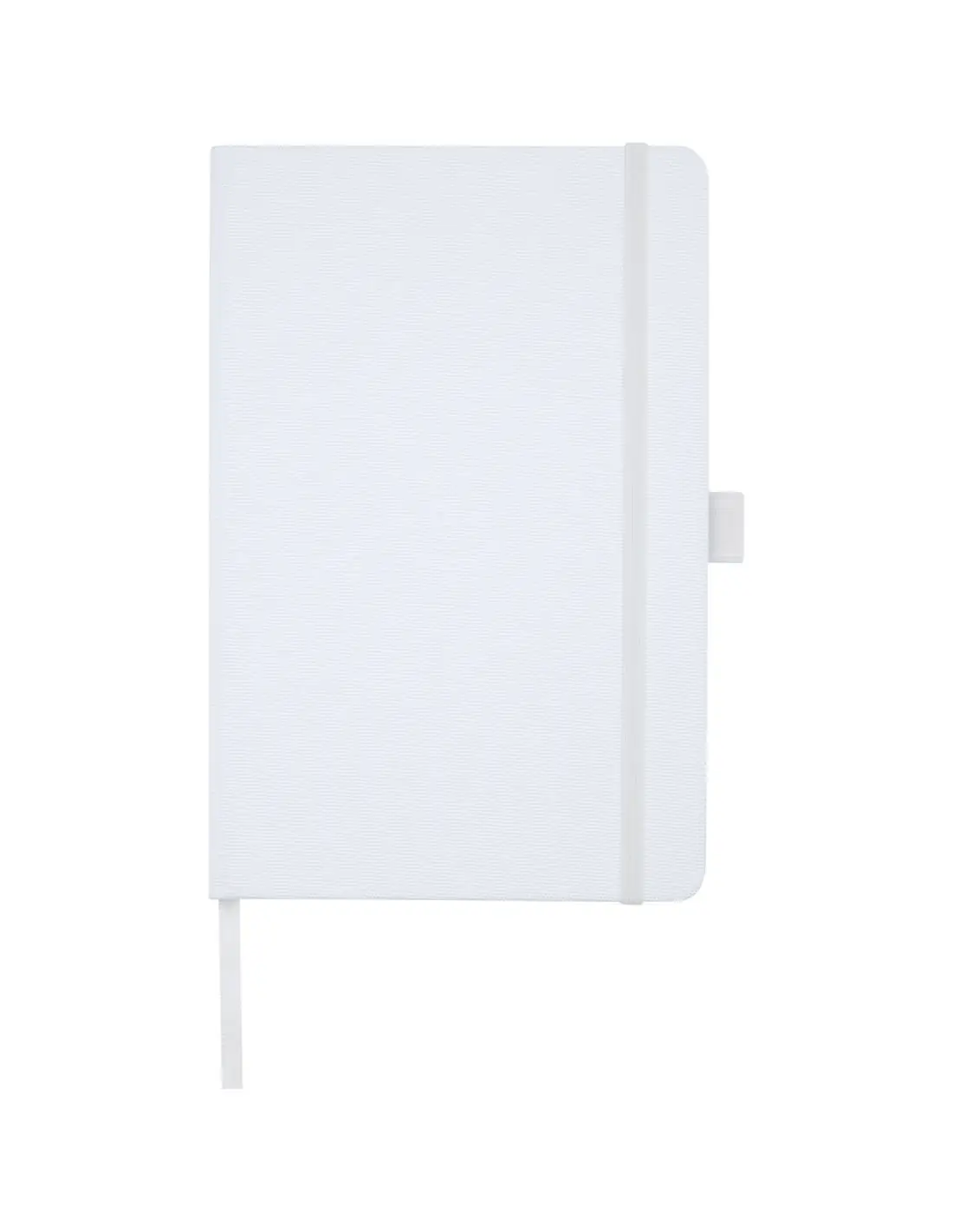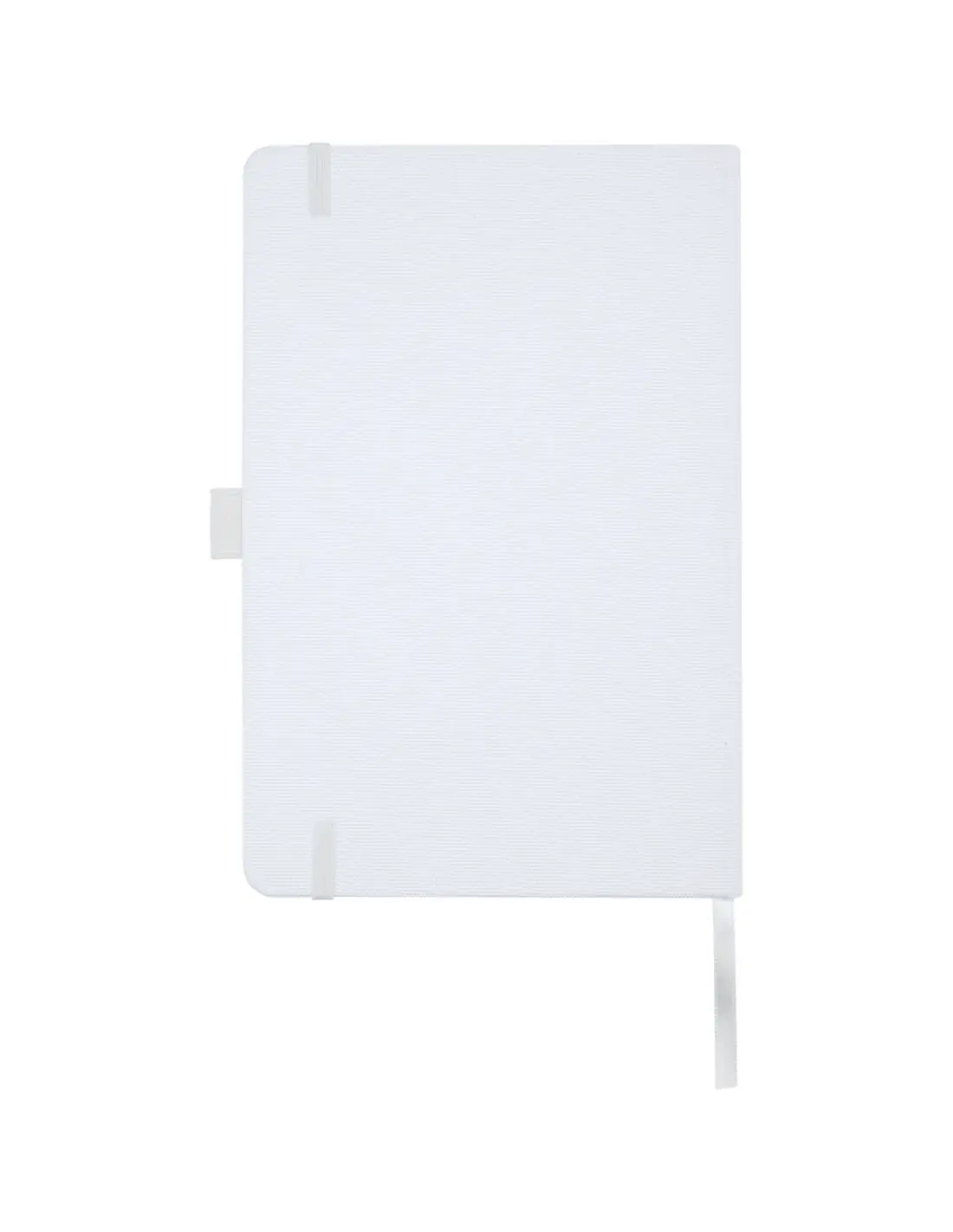 Libreta de tamaño A5 con tapa de tejido de RPET. Cuenta con 80 hojas de papel reciclado de 70 g/m² con diseño rayado, soporte para bolígrafo y cinta marcapáginas.
